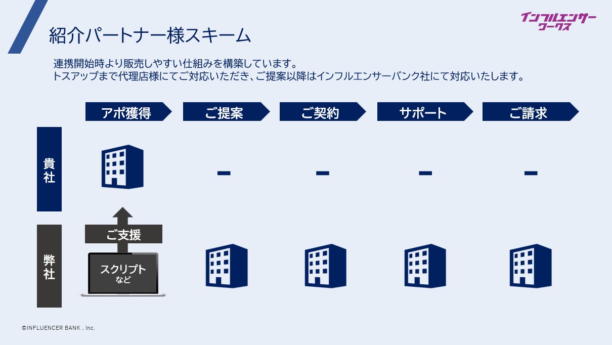 企業のインフルエンサーワークス導入までパートナーにて対応される販売パートナー制度もご用意しております。