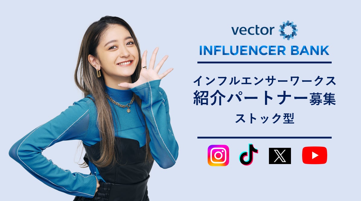 株式会社ベクトル(本社:東京都港区、代表取締役会長兼社長:西江肇司、東証プライム:6058、以下ベクトル)の子会社である株式会社INFLUENCER BANK(代表取締役:秋保 潤、以下INFLUENCER BANK)が運営する月額型インフルエンサーマッチングプラットフォーム「インフルエンサーワークス」の紹介パートナーを100社限定で募集いたします。