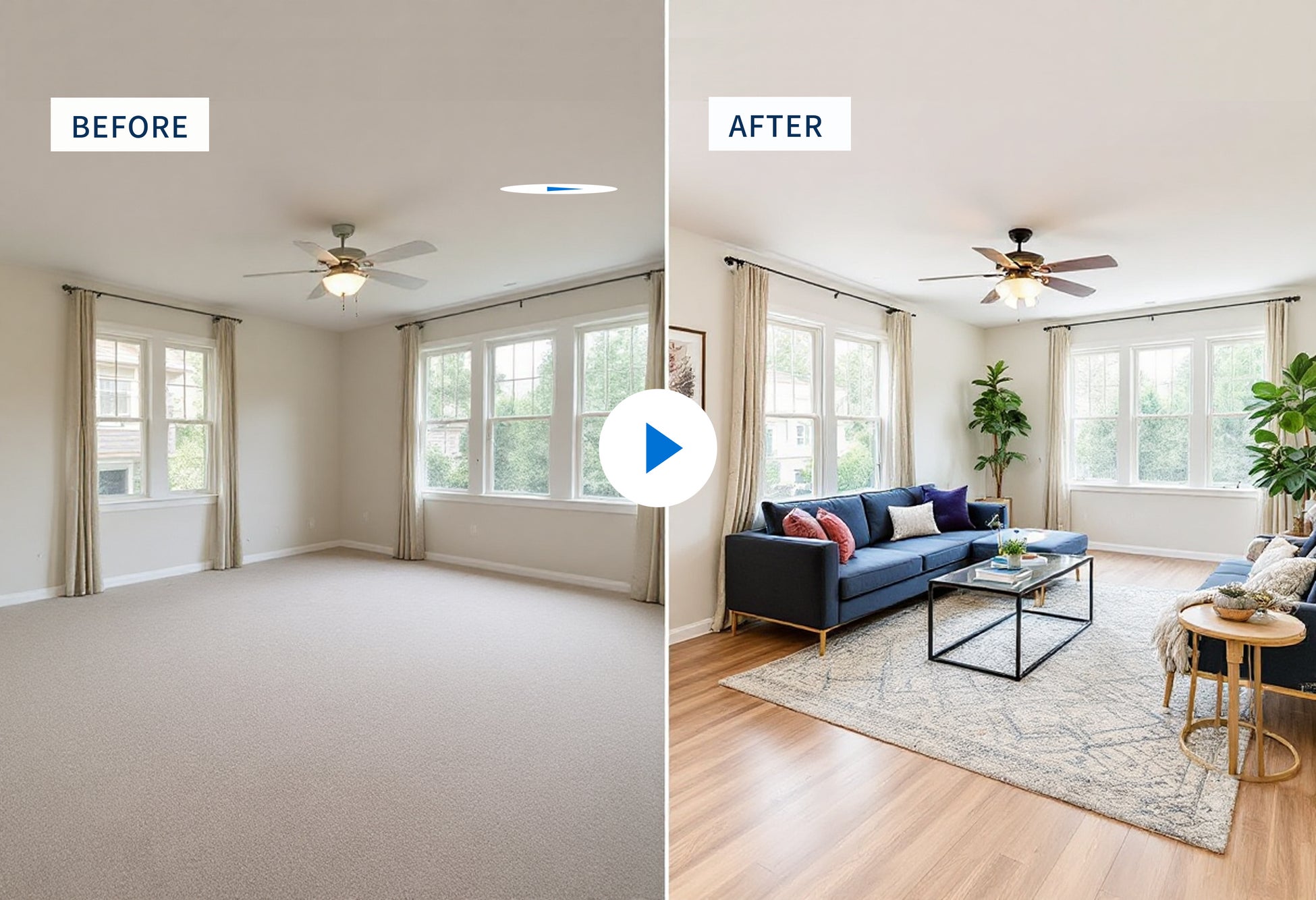 バーチャルホームステージングは、物件写真にCG技術でインテリアを追加し、住まいを探すユーザーへの訴求力を高め、クリック率・反響率アップを狙う機能です。
