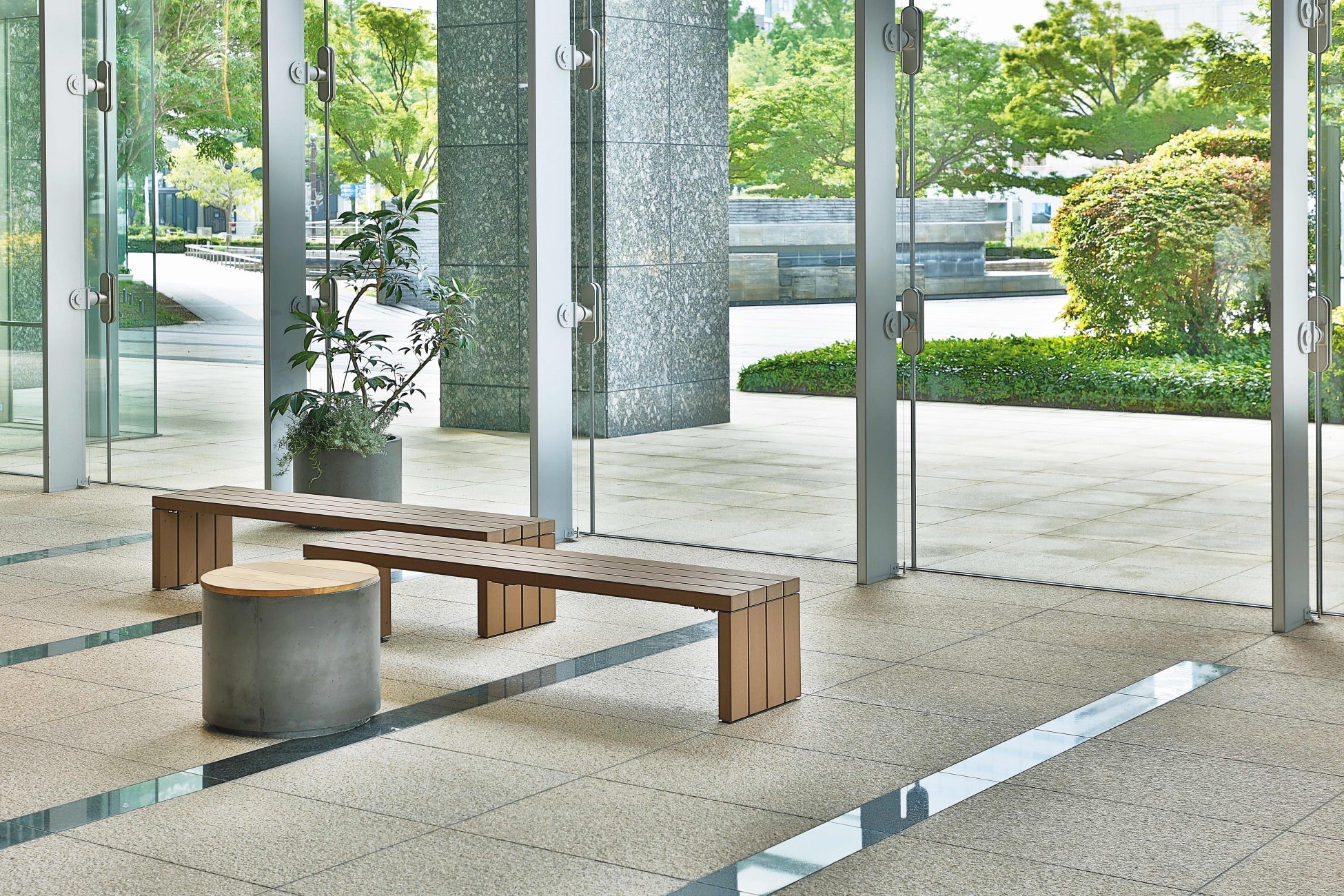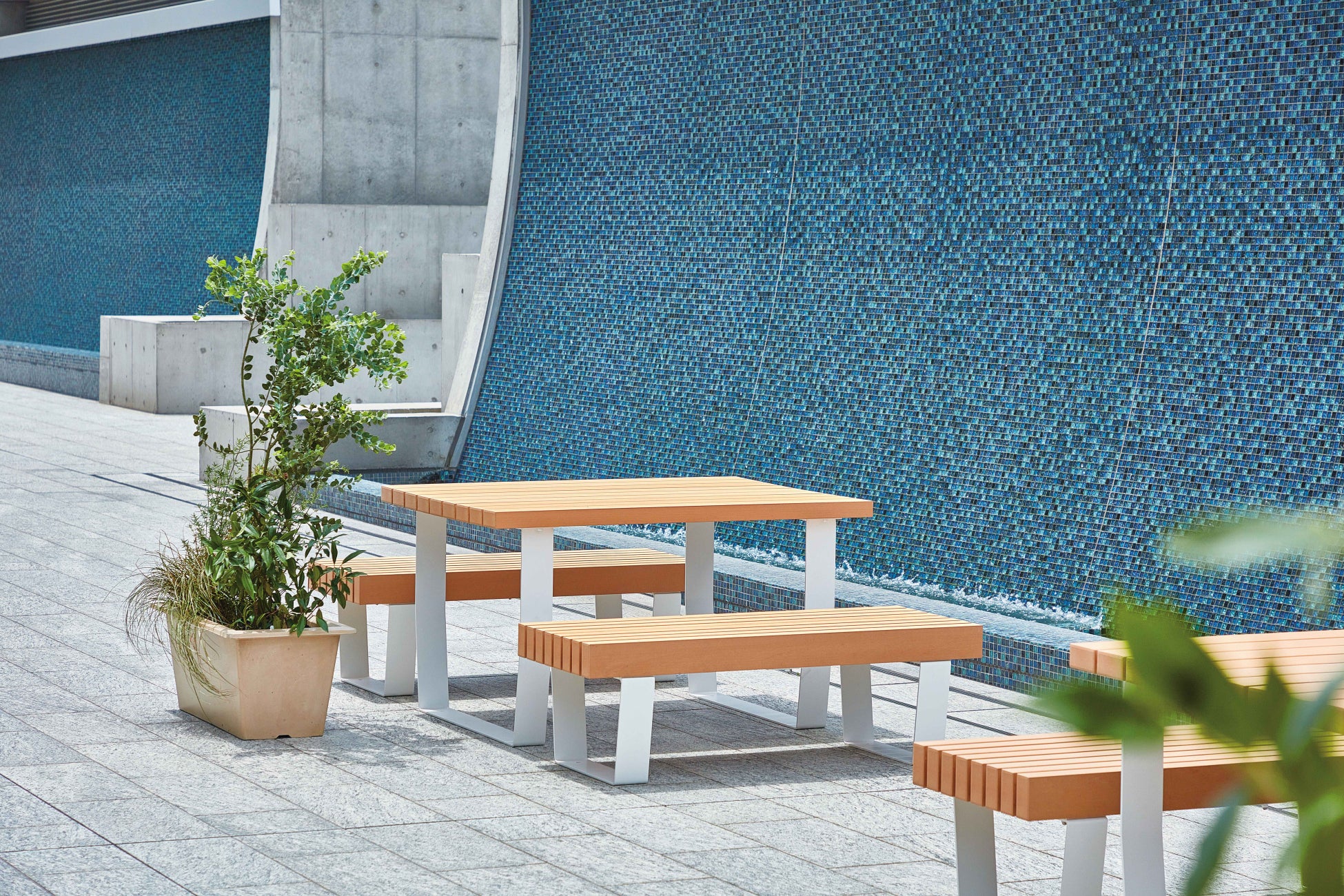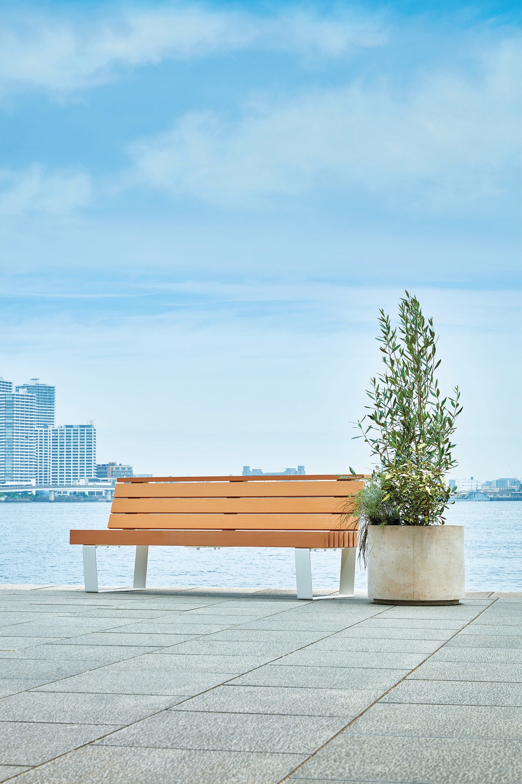 ファンダラインの⼈⼯⽊製屋外家具とニュートラルのカラーGRC 製プランターのコーディネートによって「⼈」と「まち」と「緑」を繋ぎ、もっとこの場所にいたくなるような、居⼼地の良いやさしいまちを作り出します。