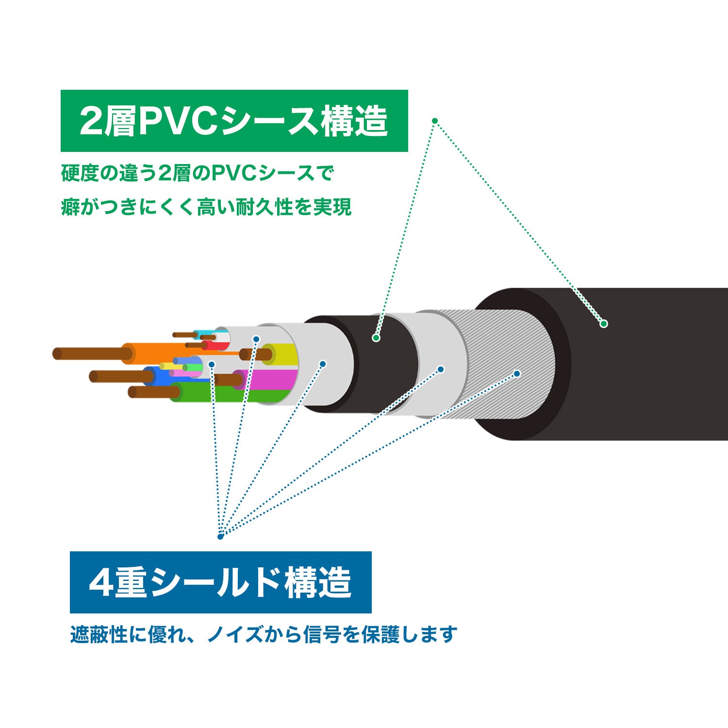 アルミ箔とアルミ編組で構成された計4層のシールドが、外部ノイズからケーブルを効果的に保護します。高いシールド性能により、イベント会場などのケーブルが混線しやすい環境でも安定したパフォーマンスを発揮します。