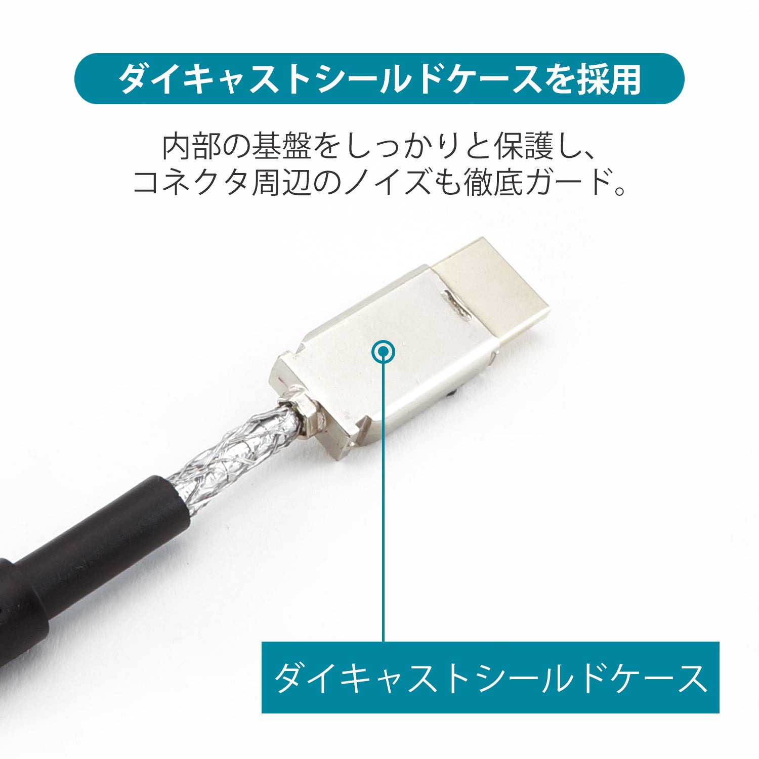 インナーのダイキャストシールドケースが内部基盤を衝撃から保護し、コネクタ付近からのノイズ侵入を最小限に抑えます。また、ケーブル部分のアルミシールドを覆うように取り付けることで、ケーブル全体の遮蔽性、ならびにケーブルとコネクタ接合部分の強度が向上しています。