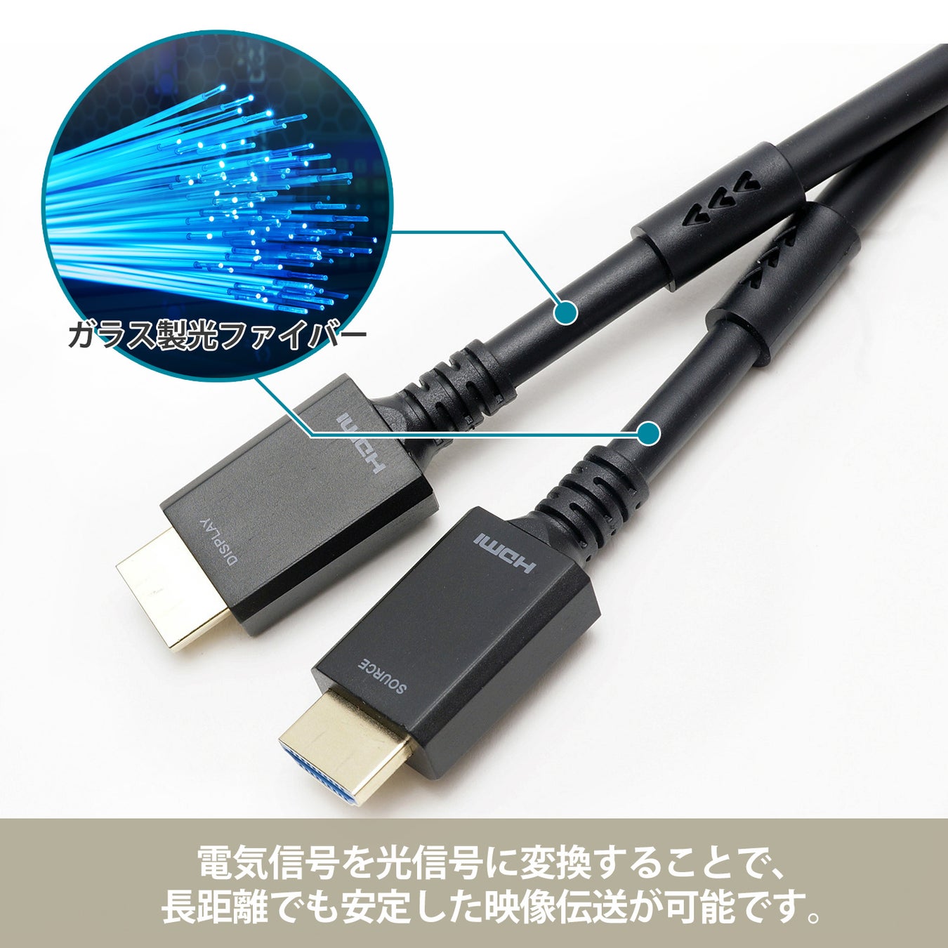 メインの信号線にガラス製光ファイバーを使用したハイブリッドHDMIケーブルです。銅線のみのHDMIケーブルに比べて信号の損失が少なく、ノイズの影響を受けにくいため、安定した長距離伝送が可能です。