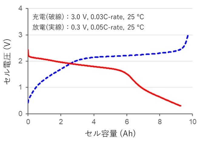 試作セルは、次世代電池の開発促進を支援しているソフトバンク株式会社の次世代電池Lab.(※5)で充放電試験を行いました。タブと外装体を含んだ試作セルの重量は25.2gであり、25℃, 0.05Cの条件で放電した時の容量(9.27Ah)と電圧(1.50V)から、セルの軽量性の指標である重量エネルギー密度は552Wh/kgと算出しました(充放電の繰り返し特性は、今後検証予定)。