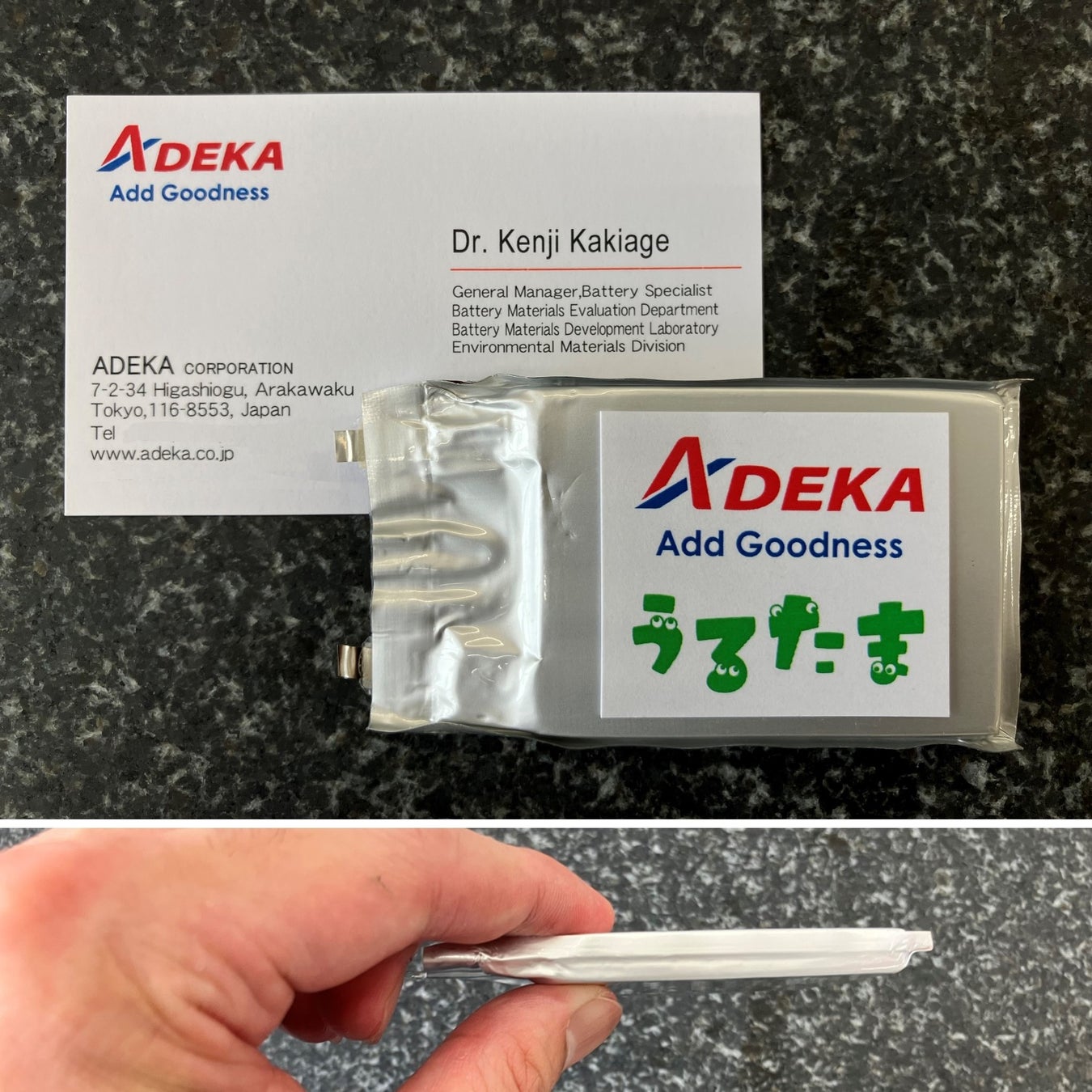 株式会社ADEKA(代表取締役社長兼社長執行役員: 城詰秀尊、本社:東京都荒川区)は、うるたま株式会社とともに、世界で初めて(※1)当社で開発中の次世代二次電池向け正極材「SPAN」と樹脂箔から構成される正極を用いた軽量二次電池「軽量Li-SPAN/樹脂箔パウチセル」(※2)の試作に成功しました。さらに、試作品の充放電および安全性(釘刺し)試験において、重量エネルギー密度500Wh/kg以上と未発火を達成し、樹脂箔を用いたなかで世界最軽量(※1)かつ発火安全性に優れる二次電池の実証にも成功しました。