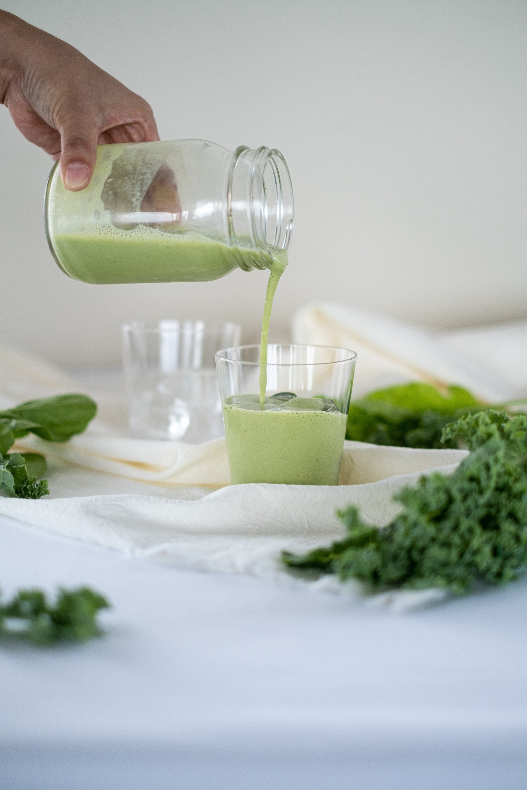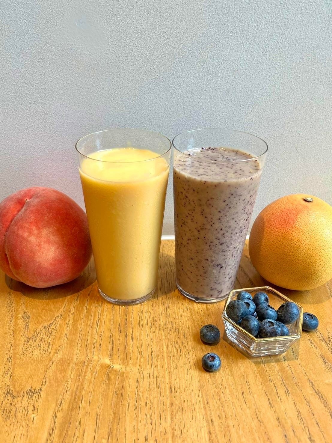 左:桃とパイナップルのスムージー、右:ブルーベリーとピンクグレープフルーツのスムージー