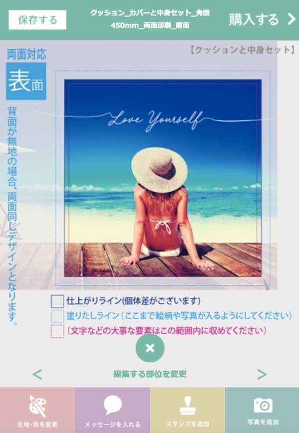 下記URLをクリックすると、オリジナルクッション作り(クッションカバーと中身セット・両面印刷)が体験できます。デザイン作成は無料です。もしお気に入りのデザインができればもちろん購入可能!