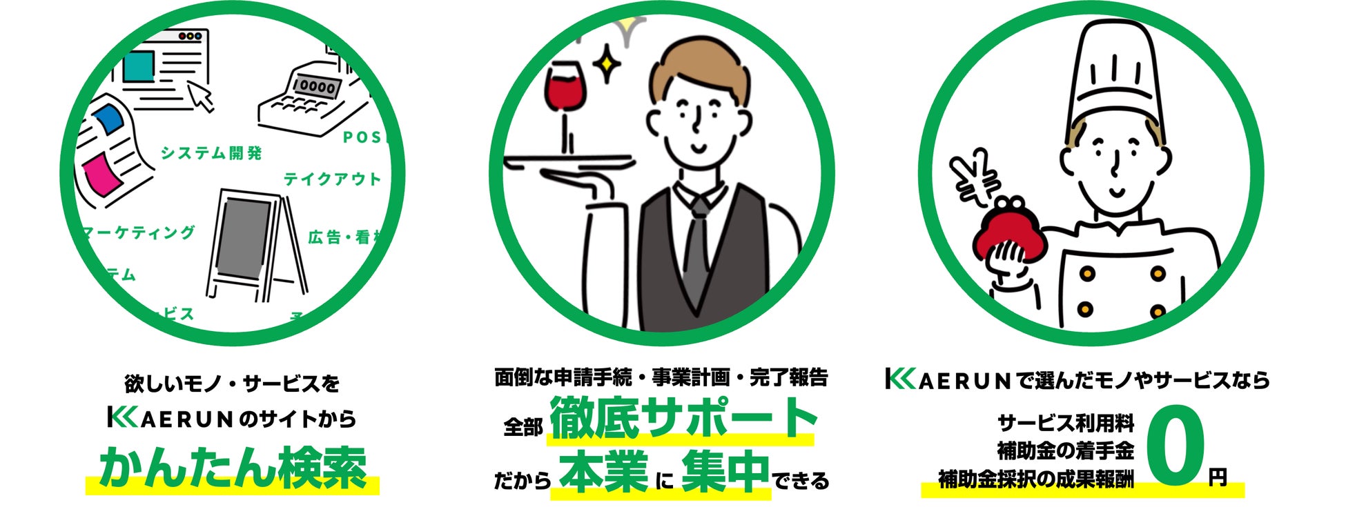 補助金で飲食店のDXを促進。飲食店向け補助金プラットフォーム「KAERUN」を賛助会員向けに無償提供。