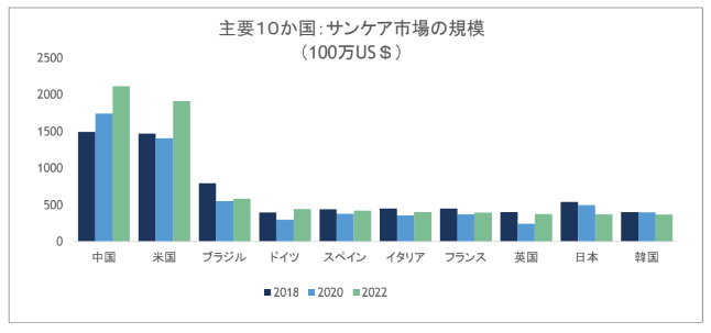 2020年度のサンケア市場は、新型コロナウイルスの影響を色濃く受けましたが、2022年は回復傾向の国が多いものの、ばらつきが見られます。売り上げ金額で見た場合の、主要10か国の2015年から10年間の成長予測を 比較すると、市場の規模は中国と米国が他を大きく引き離しています。