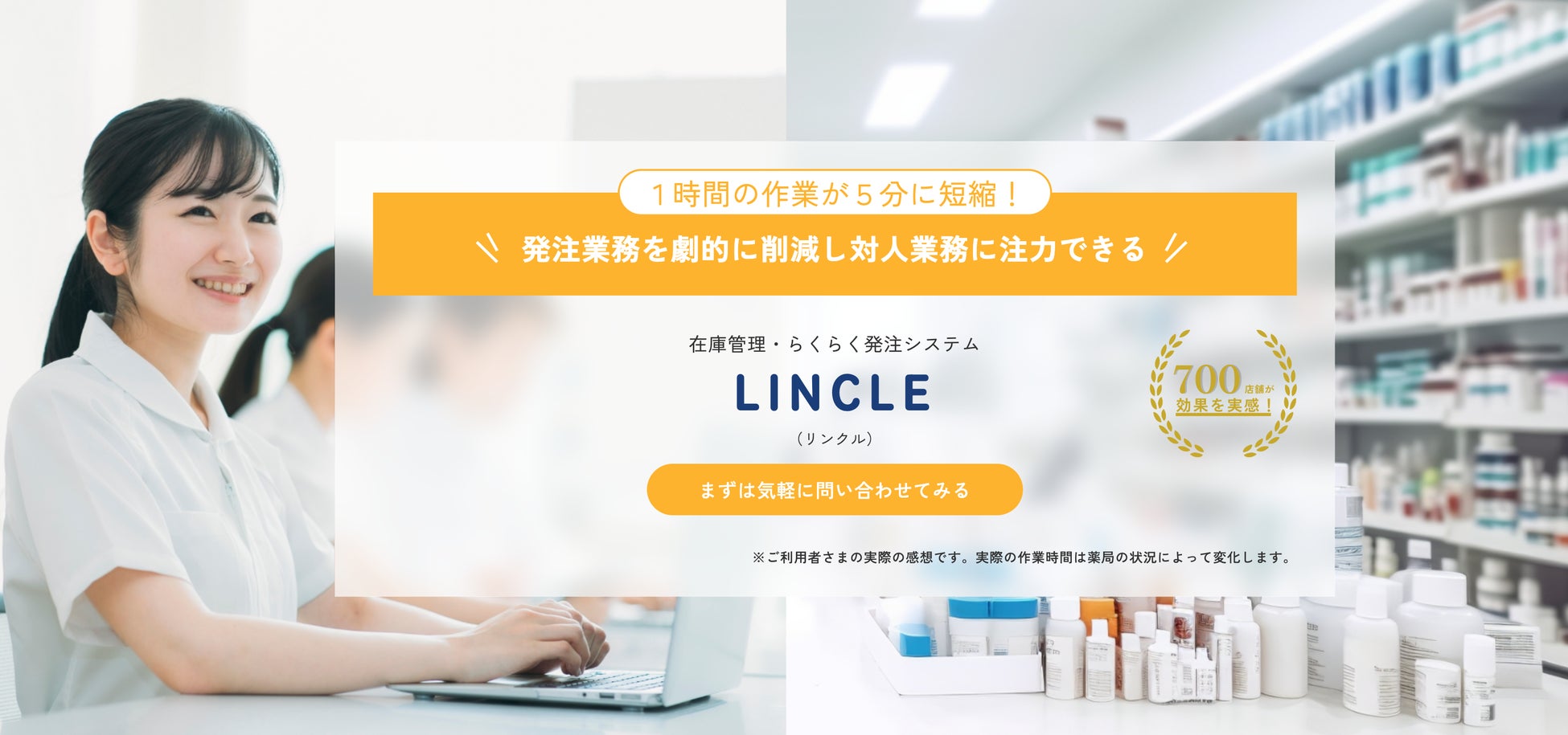 「LINCLE(リンクル)」は薬局の業務を効率化し、対人業務へのシフトを可能にする医薬品在庫管理システムです。過去の処方量や来局頻度などの実績から医薬品の需要を予測し、自動で発注することができます。これまで時間を要していた、発注業務にかかる手間と時間を劇的に削減します。導入された薬局の皆様には効果を実感いただけるまで、専門のチームがしっかりサポートいたします。
