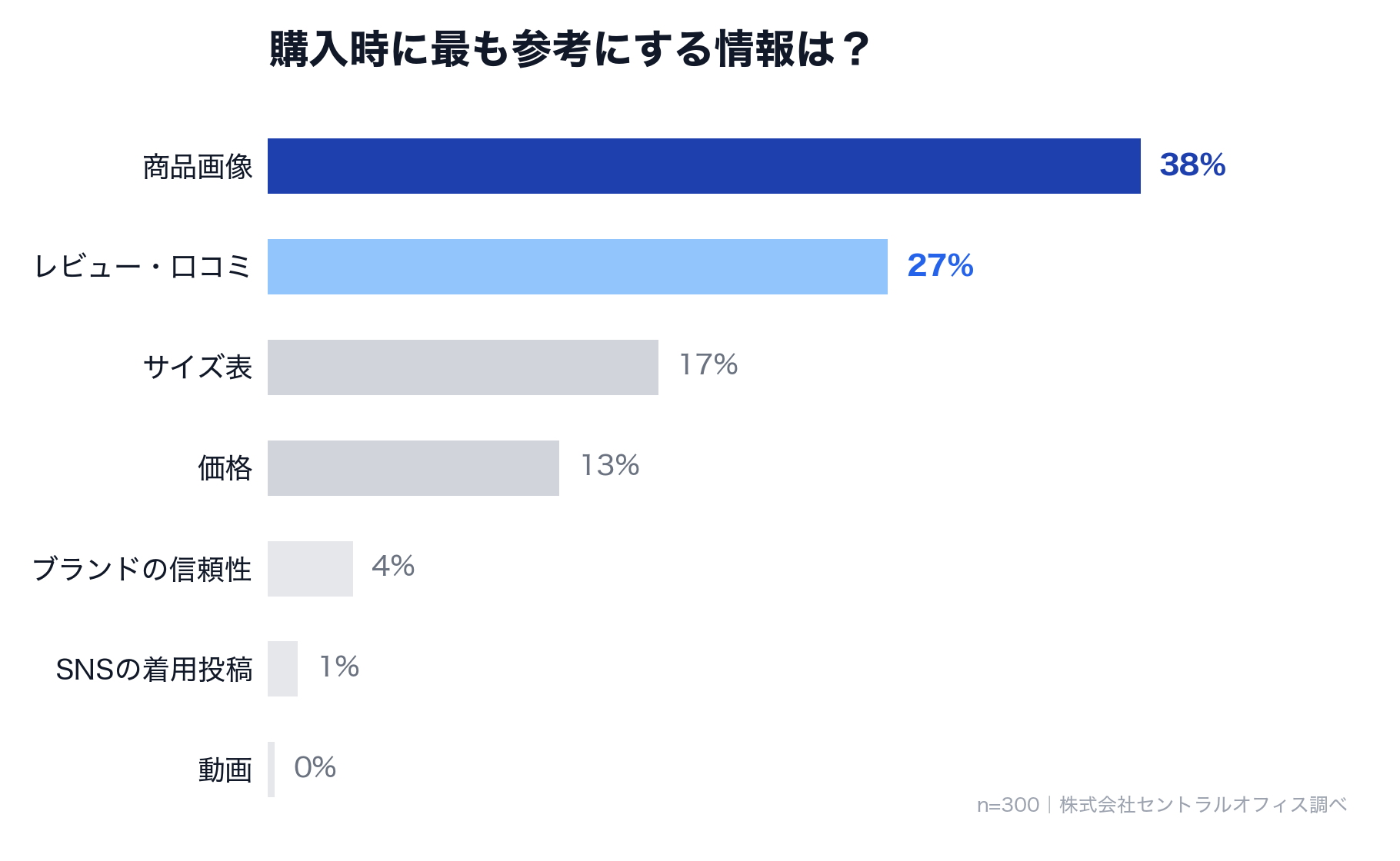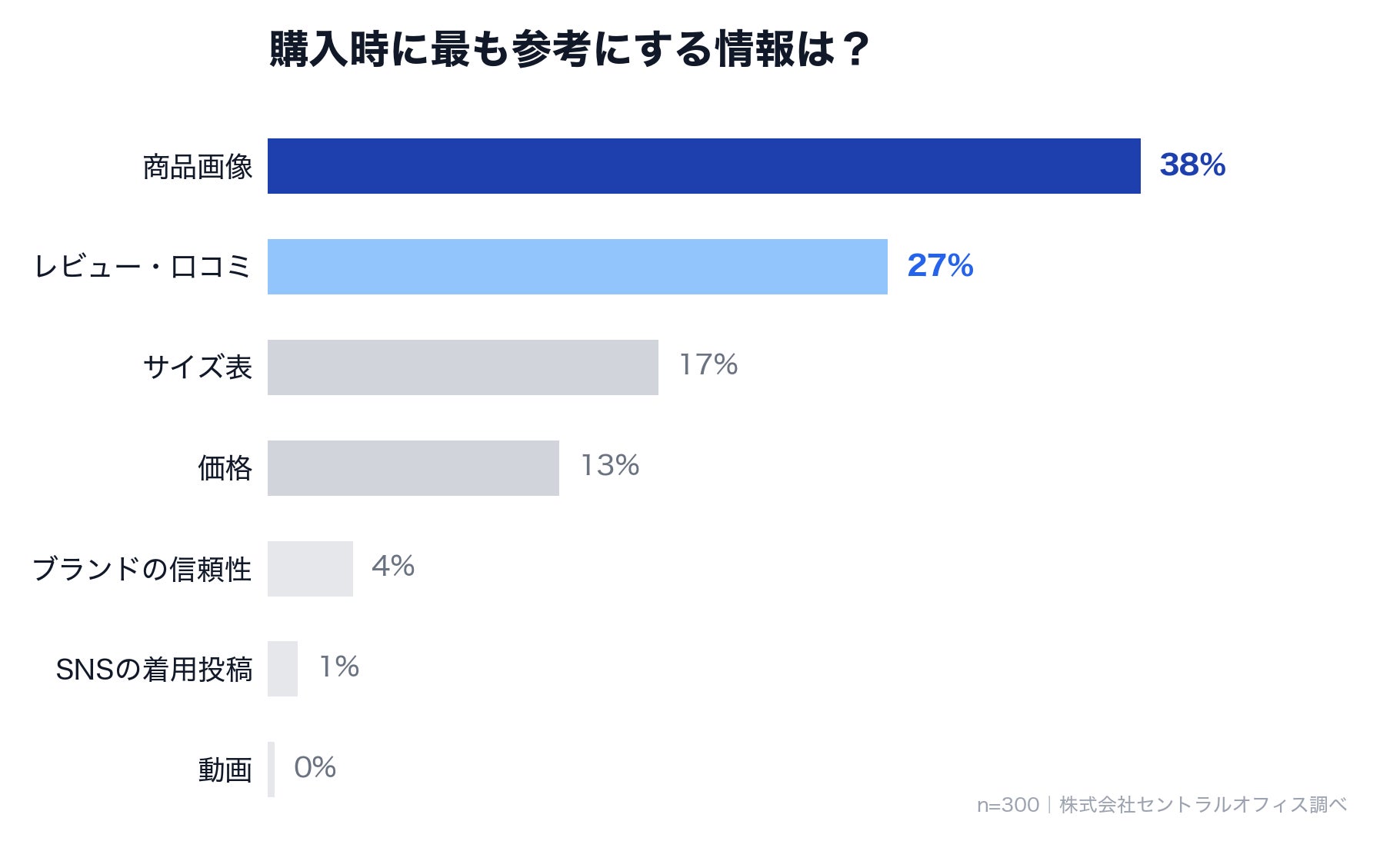 消費者の89%が商品画像を「購入の決め手になる」と回答。さらに、購入時に最も参考にする情報でも「商品画像」が38%で第1位でした(2位「レビュー・口コミ」27%、3位「サイズ表」17%)。