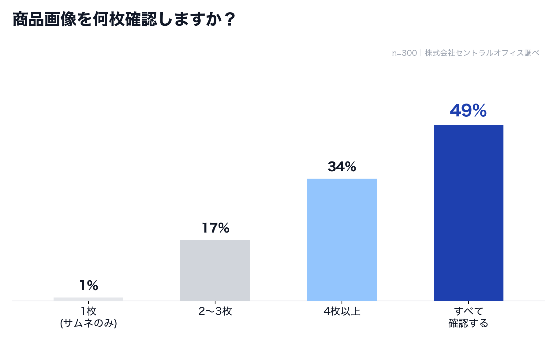 「1商品あたり何枚程度の商品画像を確認しますか?」という質問に対し、「すべて確認する」が49%で最多、「4枚以上」(34%)と合わせると、83%の消費者が4枚以上の画像を確認しています。「1枚(サムネイルだけ)で十分」と答えたのはわずか1%でした。