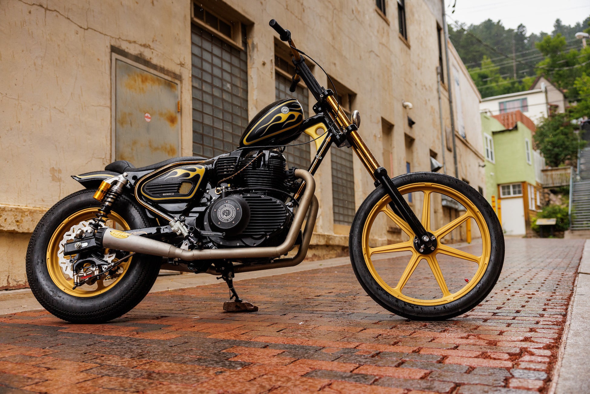 ベースマシンはSUPER METEOR 650。カスタムを手掛けたのは、カルフォルニア・ロングビーチから世界に向けてカスタムバイクを送り出すROLAND SANDS DESIGN(RSD/ローランド・サンズ・デザイン)です。フレームを大胆にチョップし、パンクロックを想起させるスタイルにカスタマイズしました。ホイールは、フロント1.85×21インチ/リア3.00×16インチサイズのRSD製モーリスホイールに交換。フロントエンドは、延長加工とインナーチューブのゴールドコーティングを施したハーレーダビッドソン・スポーツスター用フロントフォークを、幅の狭いトリプルクランプにセットしてスリム化を実現し、空冷4ストローク並列2気筒エンジンを際立たせています。リアのショックアブゾーバーは背の高いオーリンズ製に交換され、ブレーキはガルファー製ウェーブブレーキディスクローターとブレンボ製ラジアルマウント・レーシングブレーキキャリパーを装着。このバイクに際立ったストッピングパワーを提供します。
