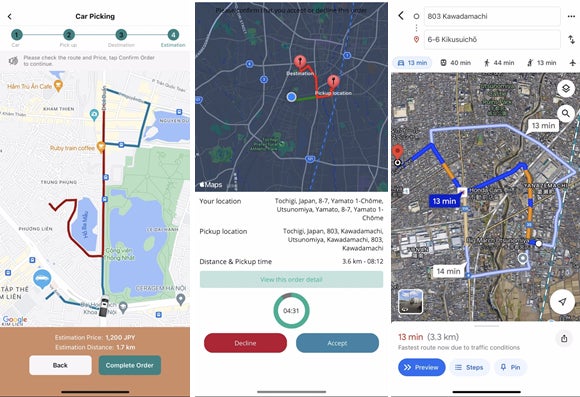 アプリ内で行き先を入力し、ライドシェアをリクエスト。到着時間や車両情報がリアルタイムで表示されます。