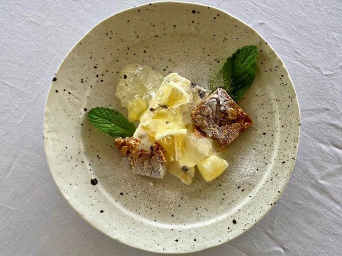 カッサータ本体の完成度はもちろん、付け合わせやトッピングなどができるレストランのひと皿として、どのように構成してお楽しみいただきたいか検討と試作を重ね、小夏の爽やかな甘み、程よい苦味、フレッシュさを感じられる、夏らしいドルチェが完成しました。