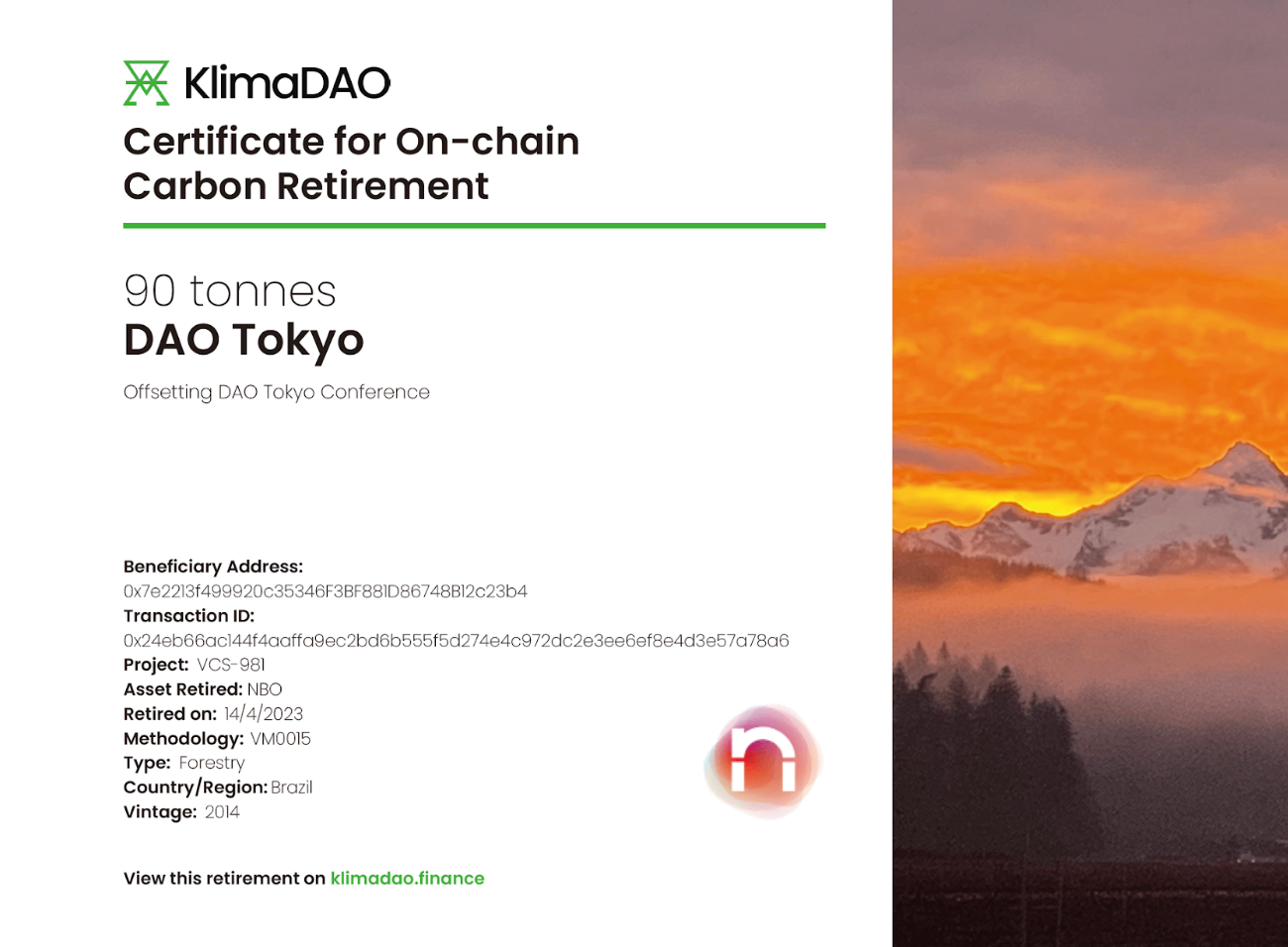 また、当社はイベント開催に伴う二酸化炭素の排出量を推定し、KlimaDAOのサポートのもとCO2排出量をオフセットしました。(詳細リンクはこちら: https://www.klimadao.finance/retirements/0x7e2213f499920c35346F3BF881D86748B12c23b4/1 )DAO関連イベントにおけるイベント実施時のCO2排出量をオフセットする取り組みは、これが世界初となります。当社はこれからも、Public Goods(公共財)の観点を軸にDAO分野で継続的に活動・貢献していく所存です。