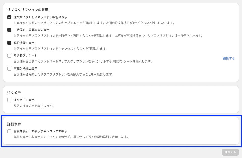 こちらを設定いただくと、詳細を表示・非表示するボタンを表示せず、最初からすべての契約詳細が表示されます。