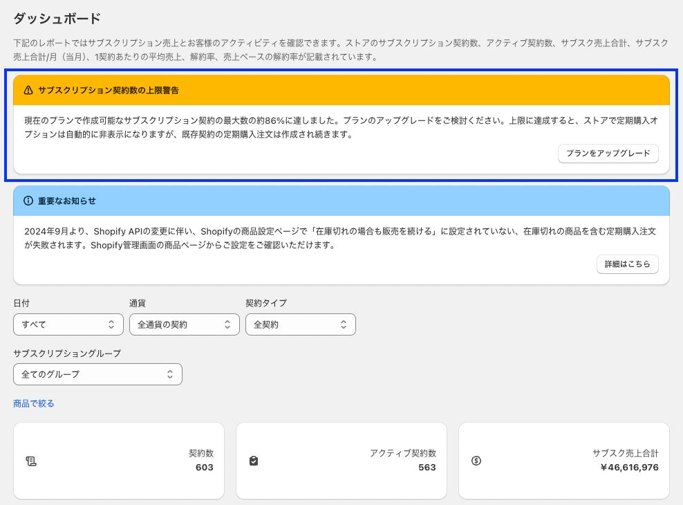 プランの契約制限を85%を超えた時点で、アプリ管理画面のダッシュボードと契約一覧ページにバナーが表示されます。