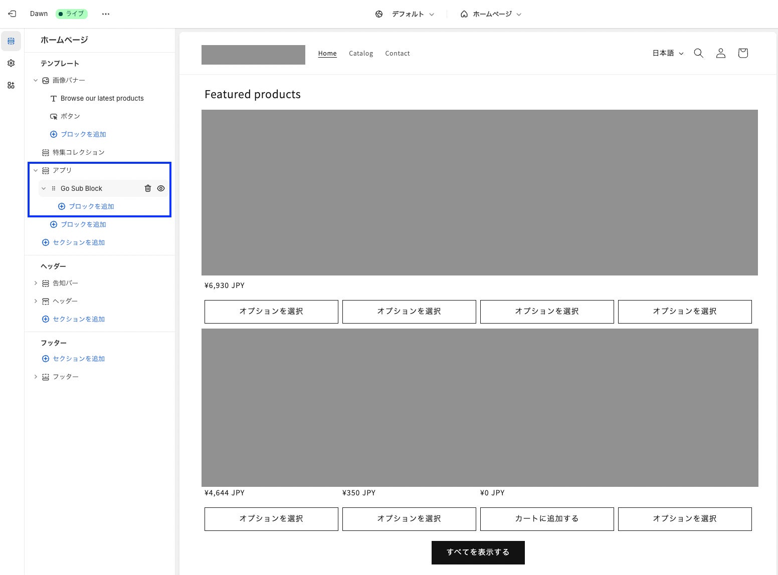 以前Go Subがテーマのコレクションページのみのクイック追加機能を対応させていただきましたが、テーマのホームページ(index)のコレクションセクションにもクイック追加機能を対応するためのGo Subアプリブロックを追加できるようになりました。