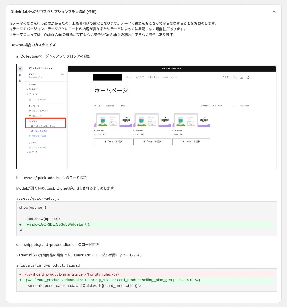 対応方法については、アプリ管理画面からテーマインストールページの「Quick Addへのサブスクリプションプラン追加 (任意)」セクションに記載しておりますので、ご確認ください。