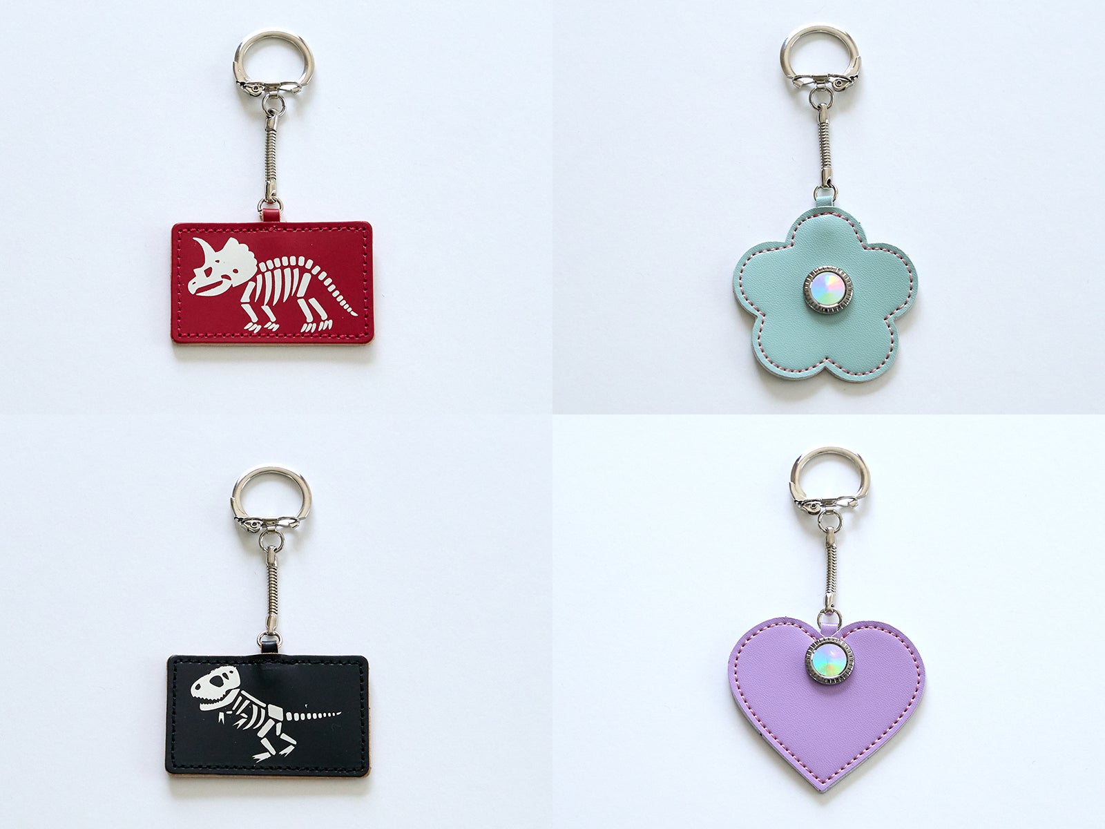 恐竜のシルエットの箔を押したキーホルダーと、反射材を使ったキラキラタイプの2タイプでカプセルトイを用意しています。