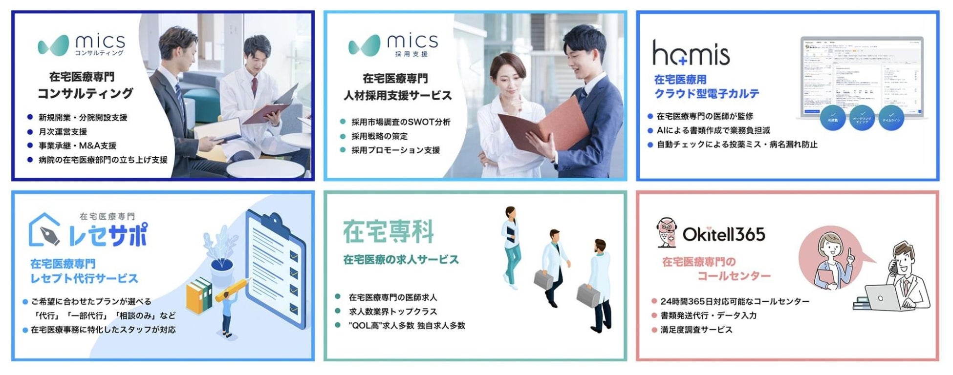 電子カルテを中心に、在宅医療にかかわるレセプト代行、事務代行、開業・承継支援、経営コンサルティング、訪問診療専門医師紹介業など総合的なサービスを提供し、在宅医療機関の開業・経営をトータルでサポートいたします。