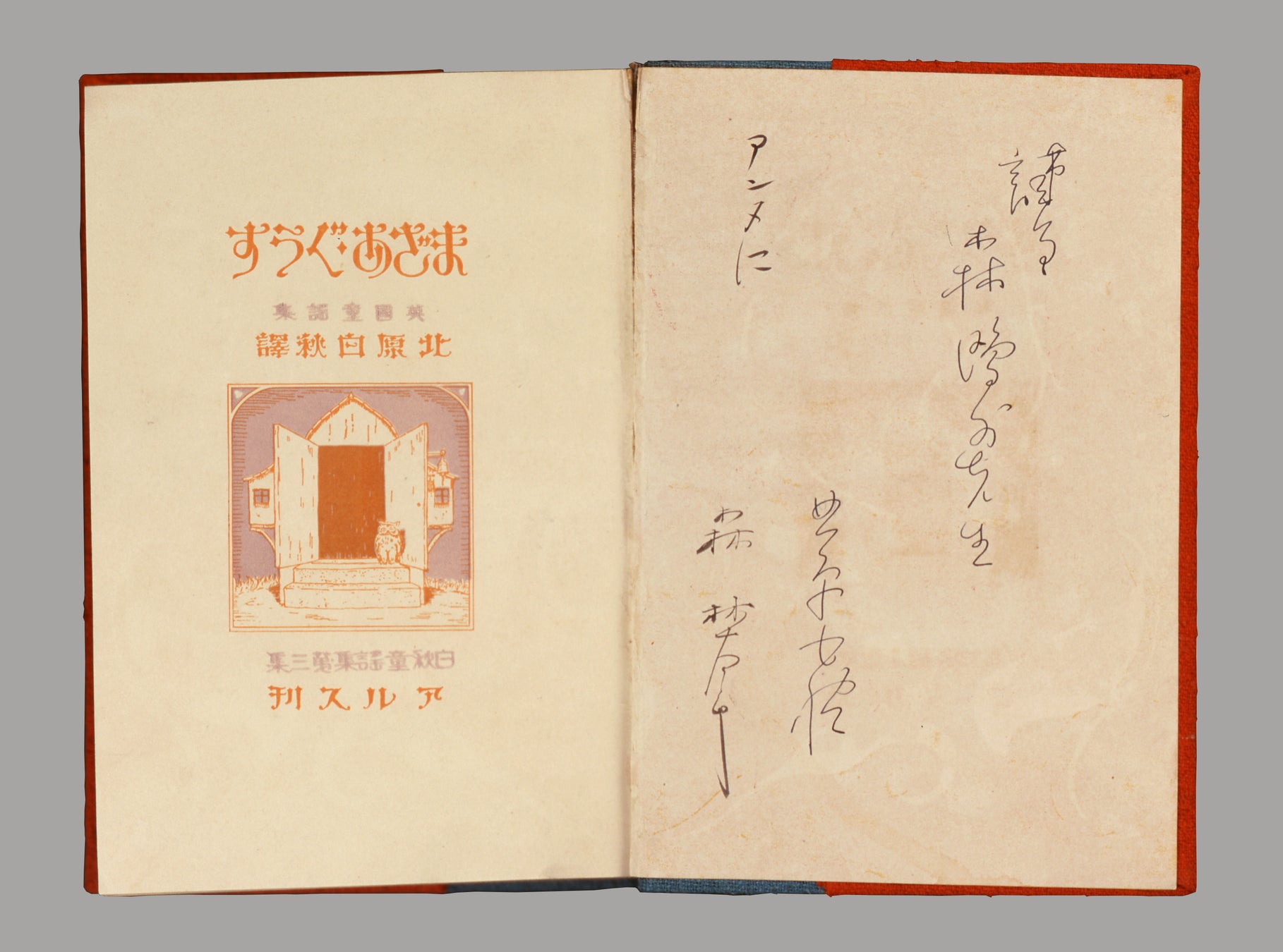 鴎外の次女・杏奴旧蔵。白秋による鴎外への献呈本に、鴎外が「アンヌに 森林太郎」と書き添えている。