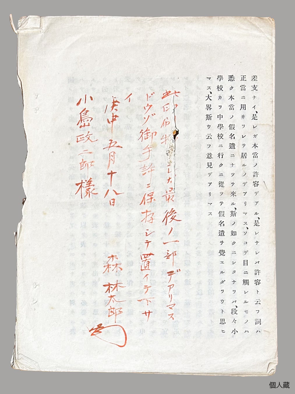 臨時仮名遣調査委員会での仮名遣い改定に対する鴎外の演説を速記させ、私家版として印刷したもの。発行部数不明。大正9年(庚申)、文学者・小島政二郎に「最後ノ一部」を贈った。署名の下は鴎外の花押。展覧会初出品。