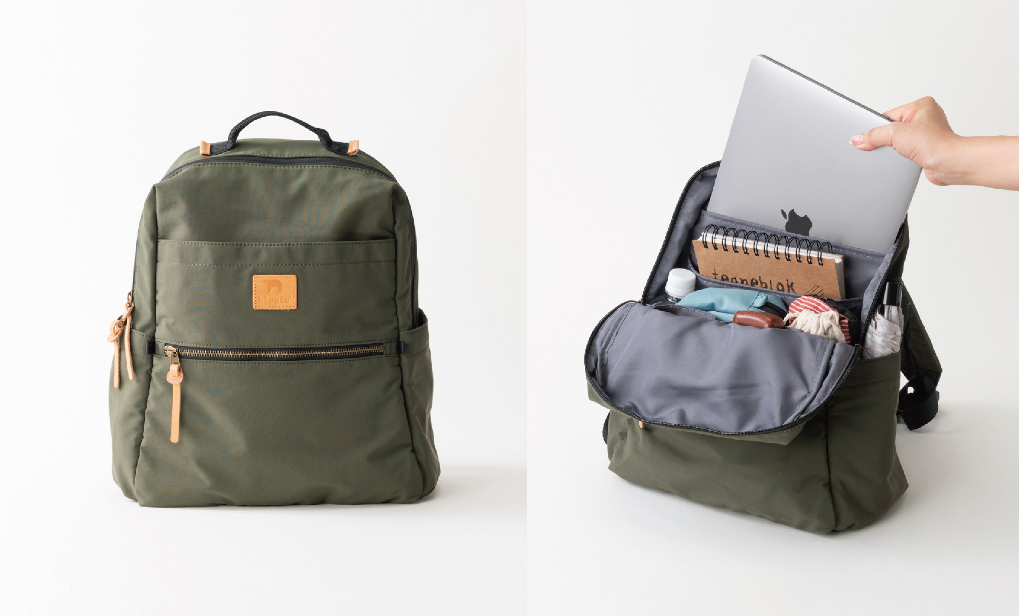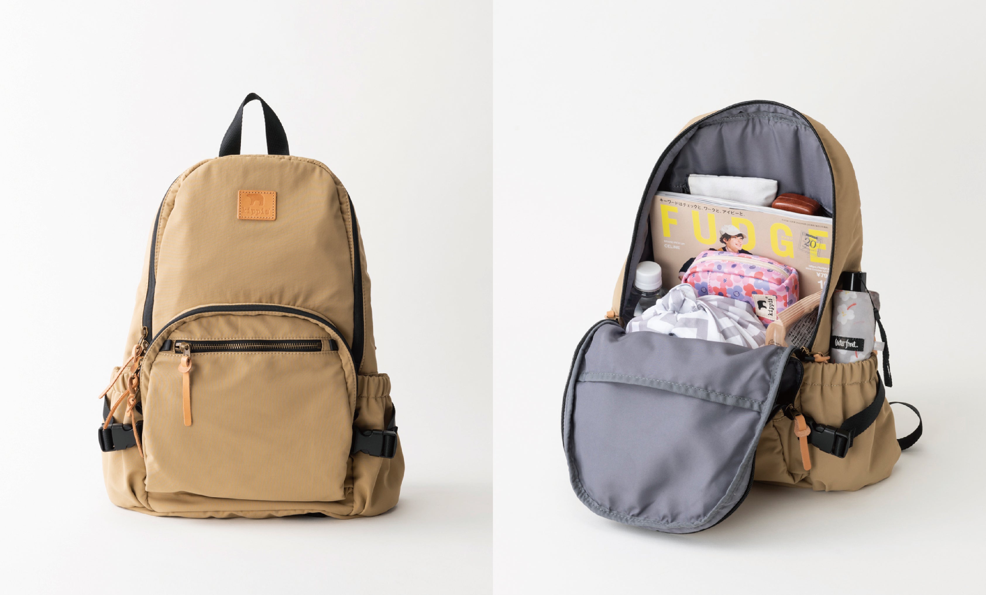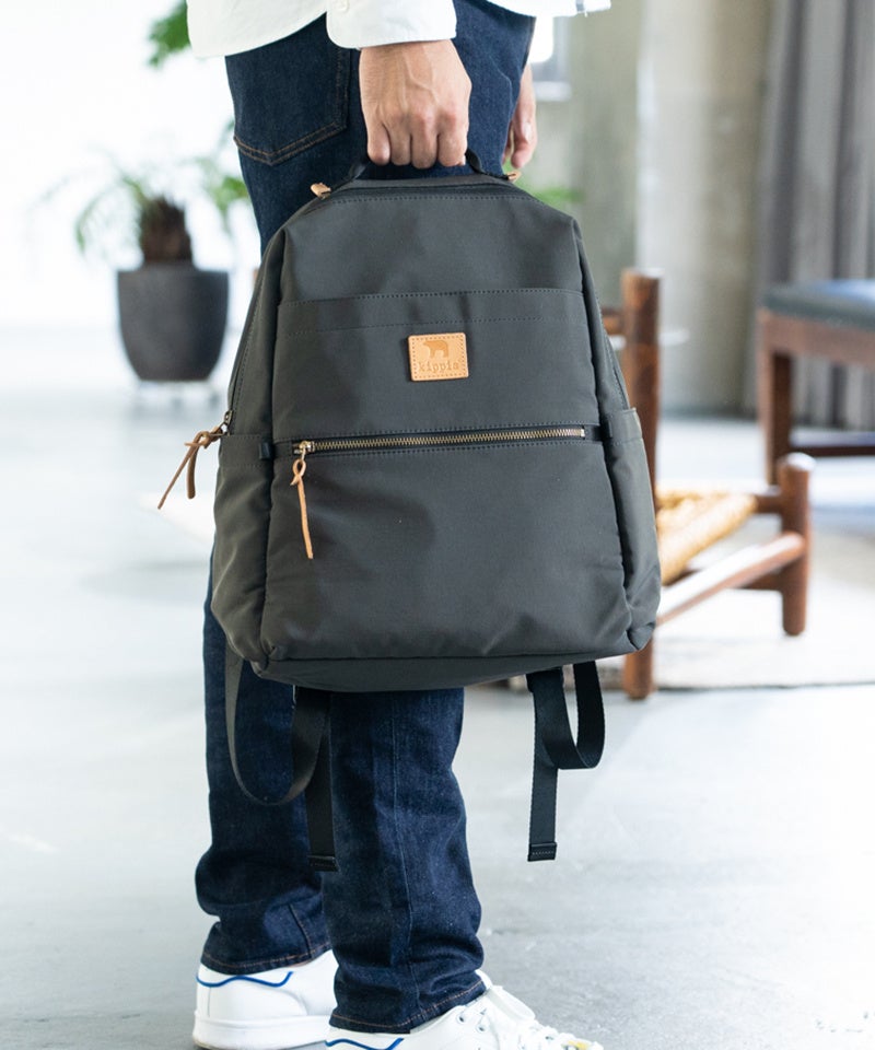 どんなシーンにも馴染みやすい、ブラック、グレー、カーキ、ベージュのベーシックカラー4色での展開に、kippisのアイコンであるシロクマを型押ししたネームには本革を使用。時間の経過と共に新しい顔を見せてくれる、愛着のあるバッグになってくれること間違いなしです。