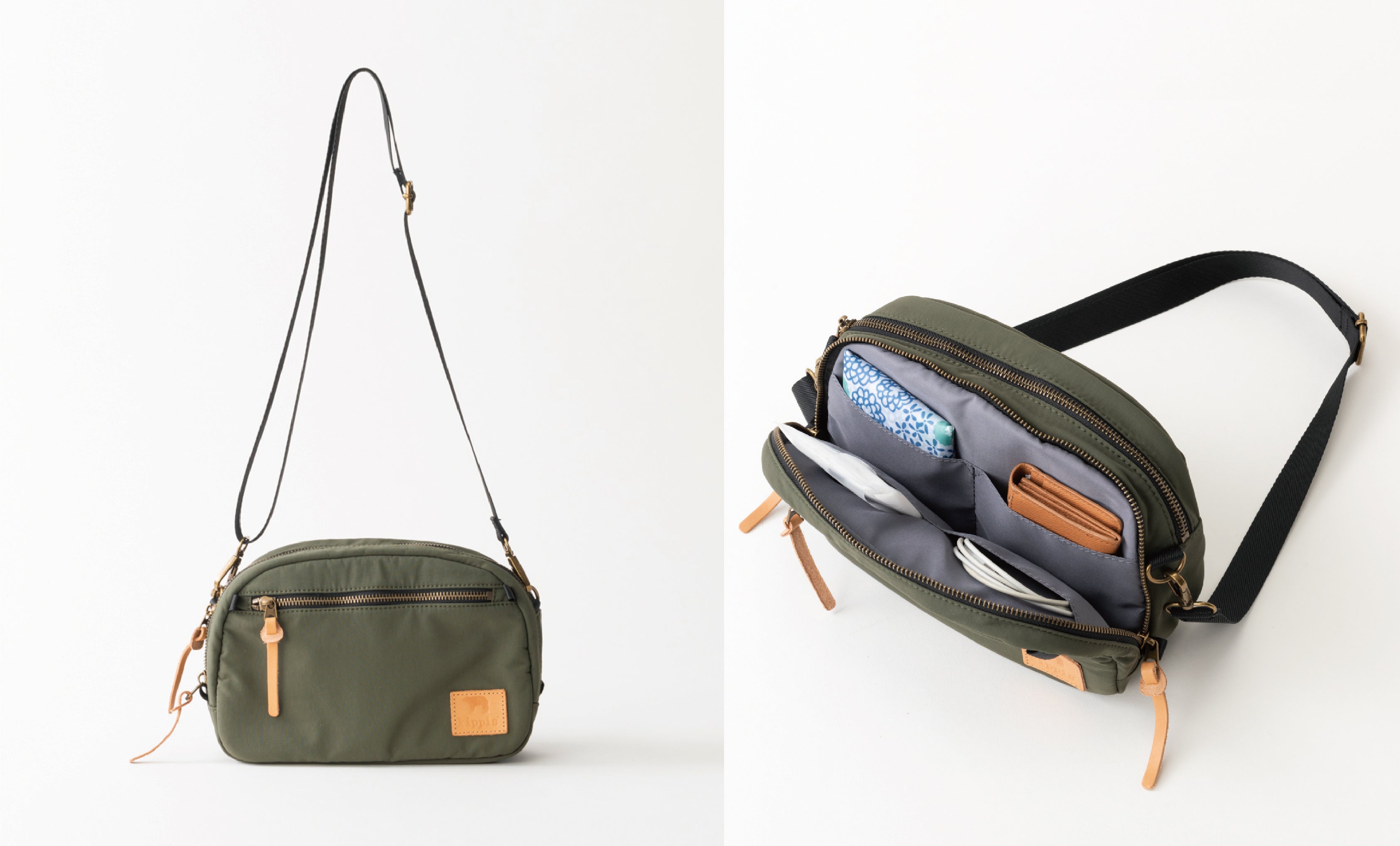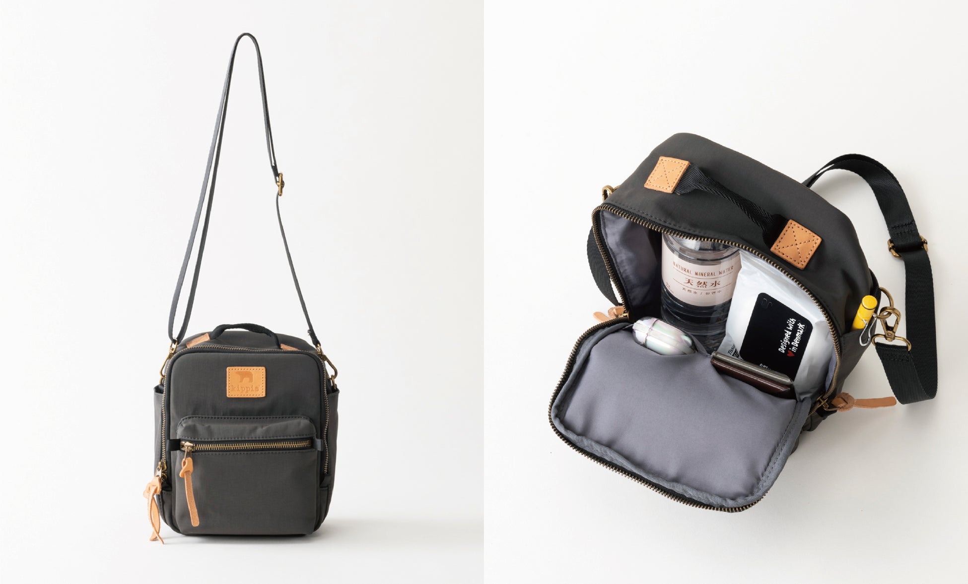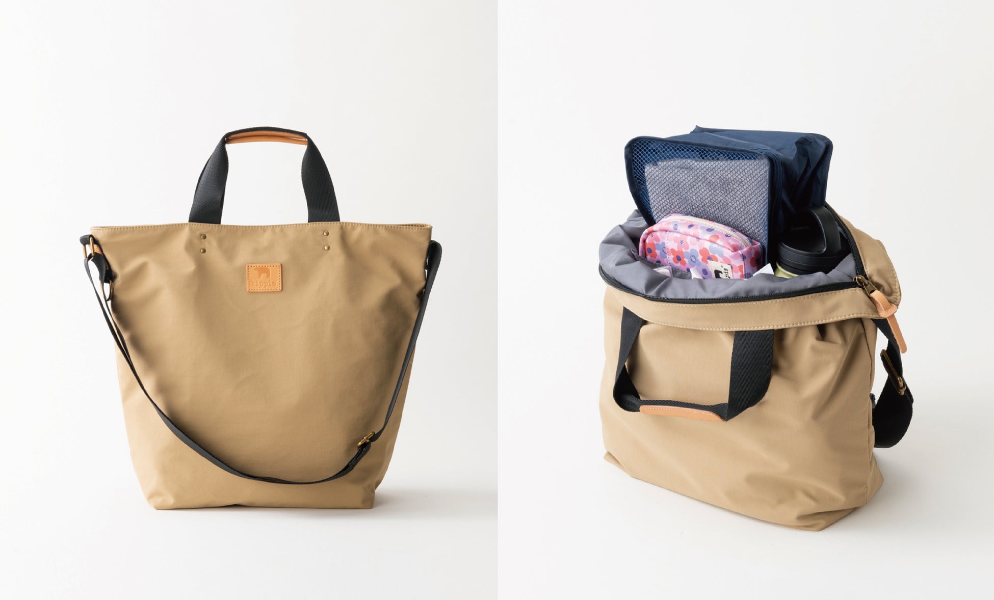 どんなシーンにも馴染みやすい、ブラック、グレー、カーキ、ベージュのベーシックカラー4色での展開に、kippisのアイコンであるシロクマを型押ししたネームには本革を使用。時間の経過と共に新しい顔を見せてくれる、愛着のあるバッグになってくれること間違いなしです。