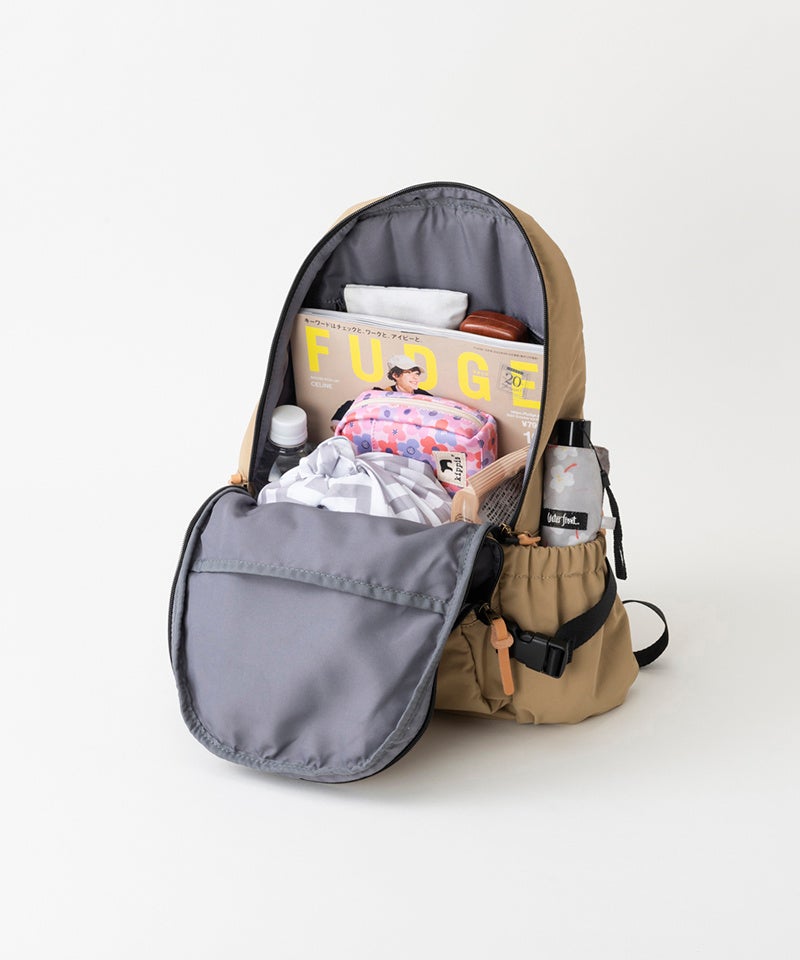 カジュアルな中にもきれいめな雰囲気があり、こなれた印象の大人なデイパック。通勤・通学のデイリーユースにも休日のお出かけにもぴったりのリュックです。容量は16ℓとしっかり確保。メインエリアは大きく開く仕様なのに加え、背中側からサッと必要なものを取り出せる貫通ファスナーがあったりと、使いやすさを考えた機能もバッチリ。しっかりと背中にフィットするので、背負いやすくたくさん入れても快適です。