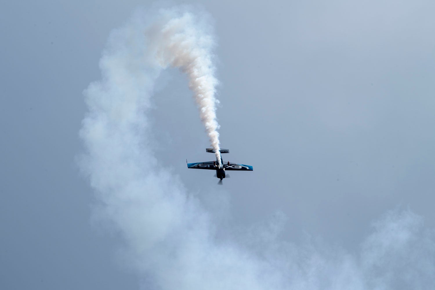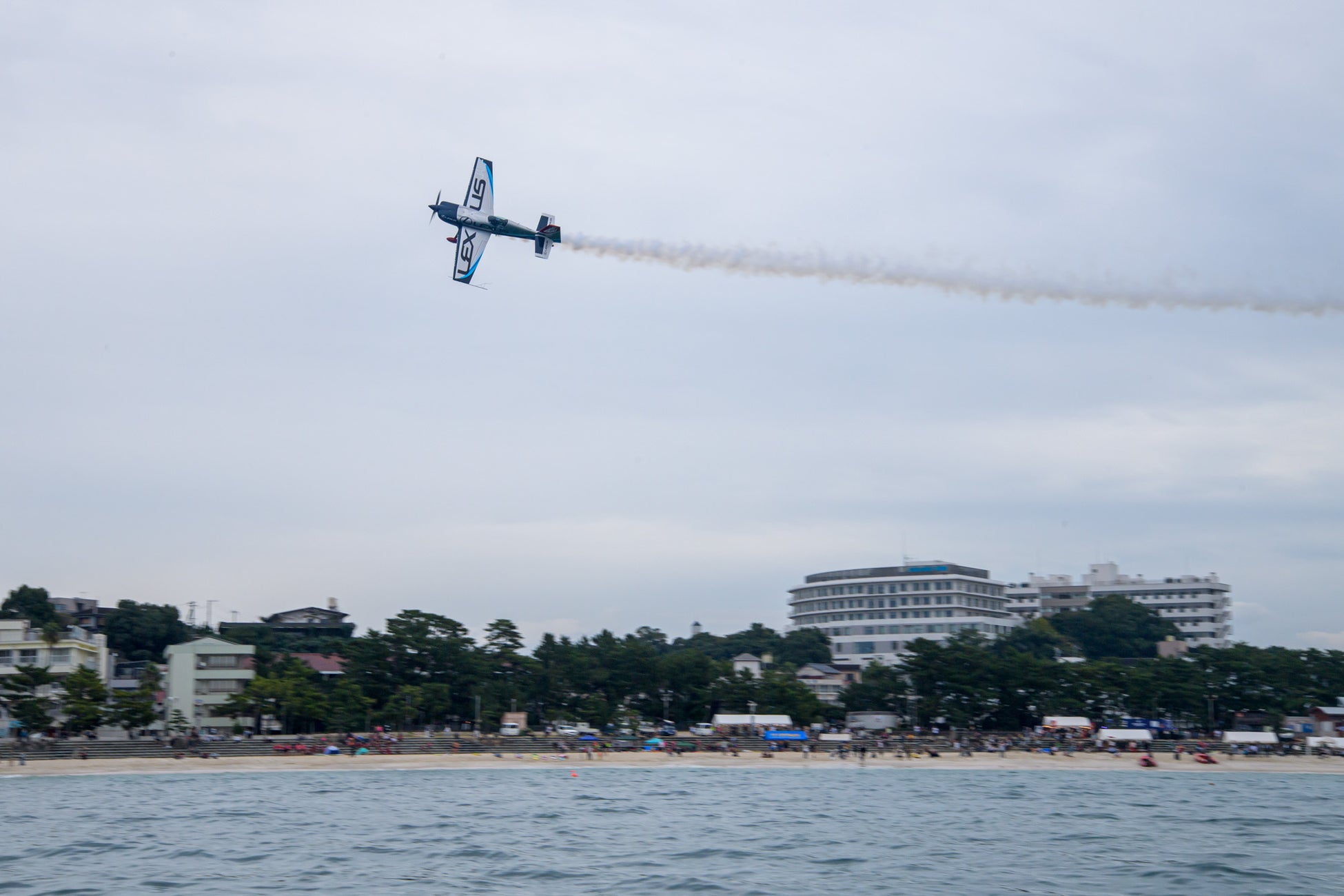碧い海と白砂のコントラストの中、機体が描くスモークの軌跡が空に広がります。観光地ならではのロケーションとフライトが融合した景観が特徴です。