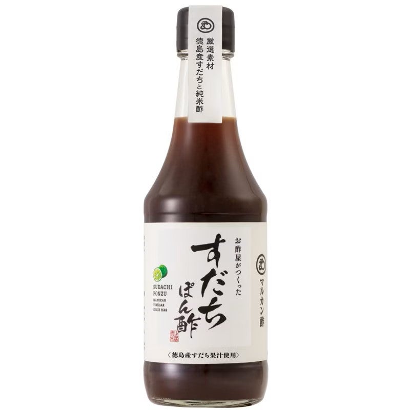 自社内でお米からつくった純米酢、徳島県産すだち果汁を1本に12個分、北海道産真昆布・焼津産かつお節だしを使用しました。鍋物、焼魚、餃子、カルパッチョやマリネによく合います。