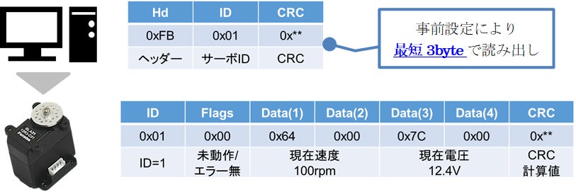 事前に書き込み/読み取り用のデータをサーボ内部で記録・指定し、送信時のヘッダーデータに紐づけて必要なデータ量を最小化します。これにより、通信時のデータ量が減り、最大60%データ伝送効率が向上します。