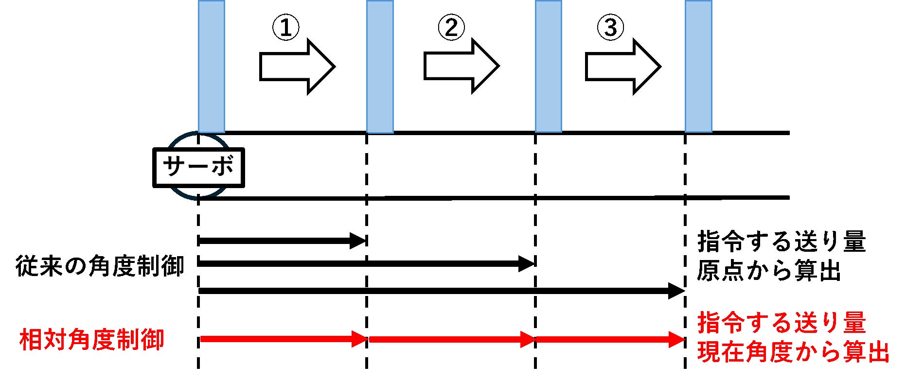 指令する角度を原点から算出する従来制御に加え、現在角度から算出して角度指令を出せる