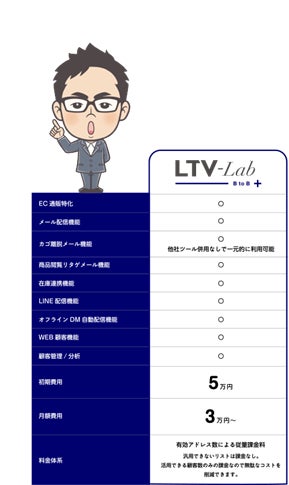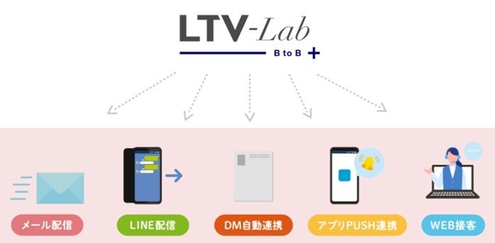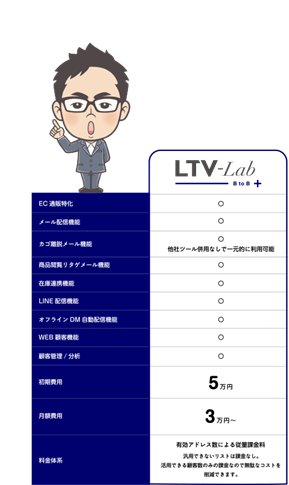 1,300店舗以上の運用実績がある費用対効果に強いCRMシステム「LTV-Lab」にBtoB事業に必要な機能を数多く搭載いたしました。主要なECカートや受注システムと自動連携が可能、顧客管理から分析、自動メール配信/ステップメール配信(LINE配信も可能)、顧客の購入商品や金額、購入期間などの分析から顧客をセグメントして、最適な顧客にメール配信やステップメール配信(無制限)を行うことができます。