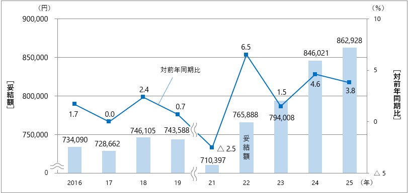 各年4月時点の集計で見た夏季一時金妥結額は、コロナ禍の影響で2021年は71万397円(対前年同期比2.5%減)と減少したが、2022年には76万5888円(同6.5%増)と大幅な増加に転じ、それ以降4年連続の増加[図表3]。