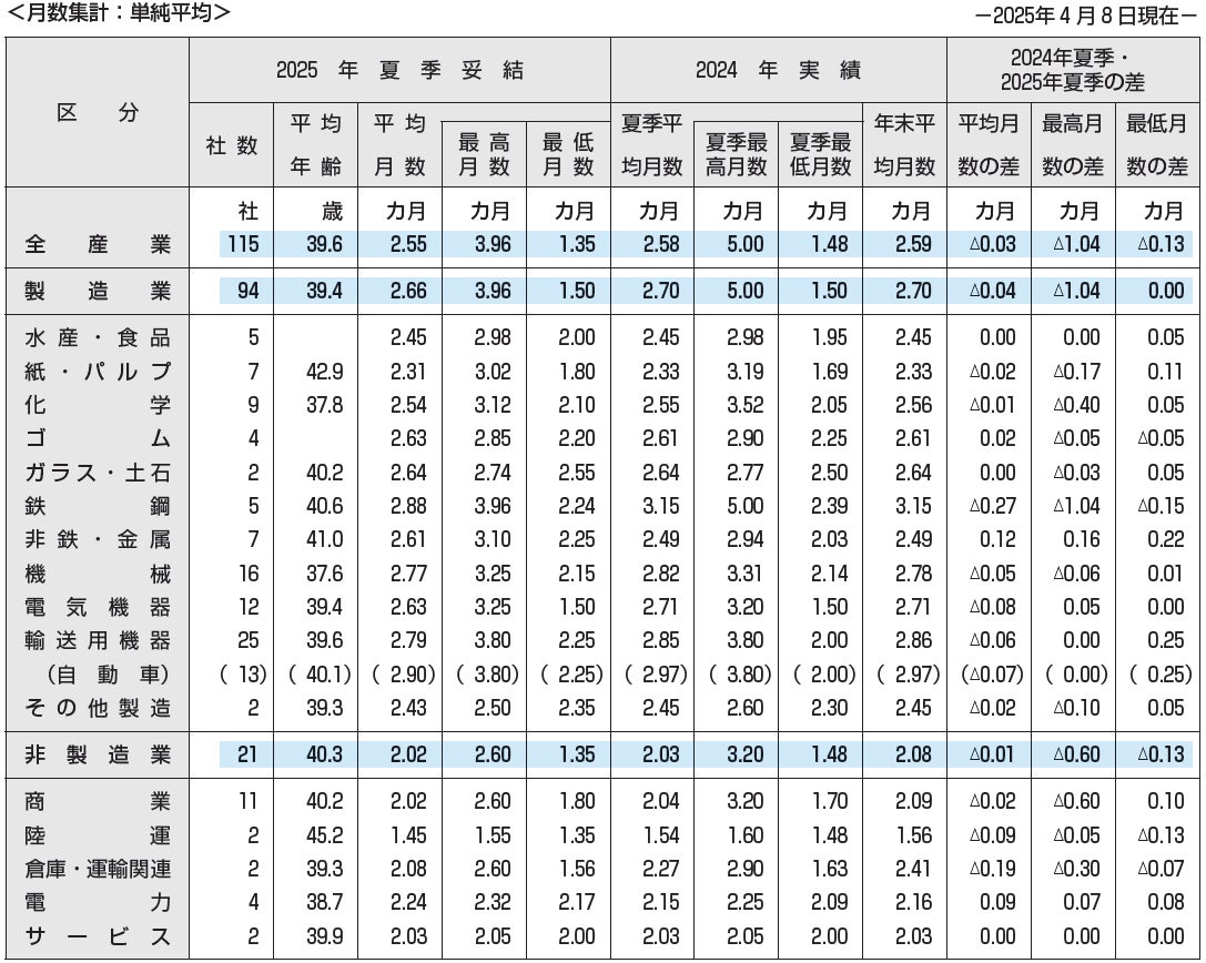 全産業115社の平均で2.55カ月。同一企業で見た場合、前年同期(2.58カ月)を0.03カ月下回った。最高月数は3.96カ月と前年同期(5.00カ月)を下回り、最低月数も1.35カ月と前年同期(1.48カ月)より低い[図表4]。
