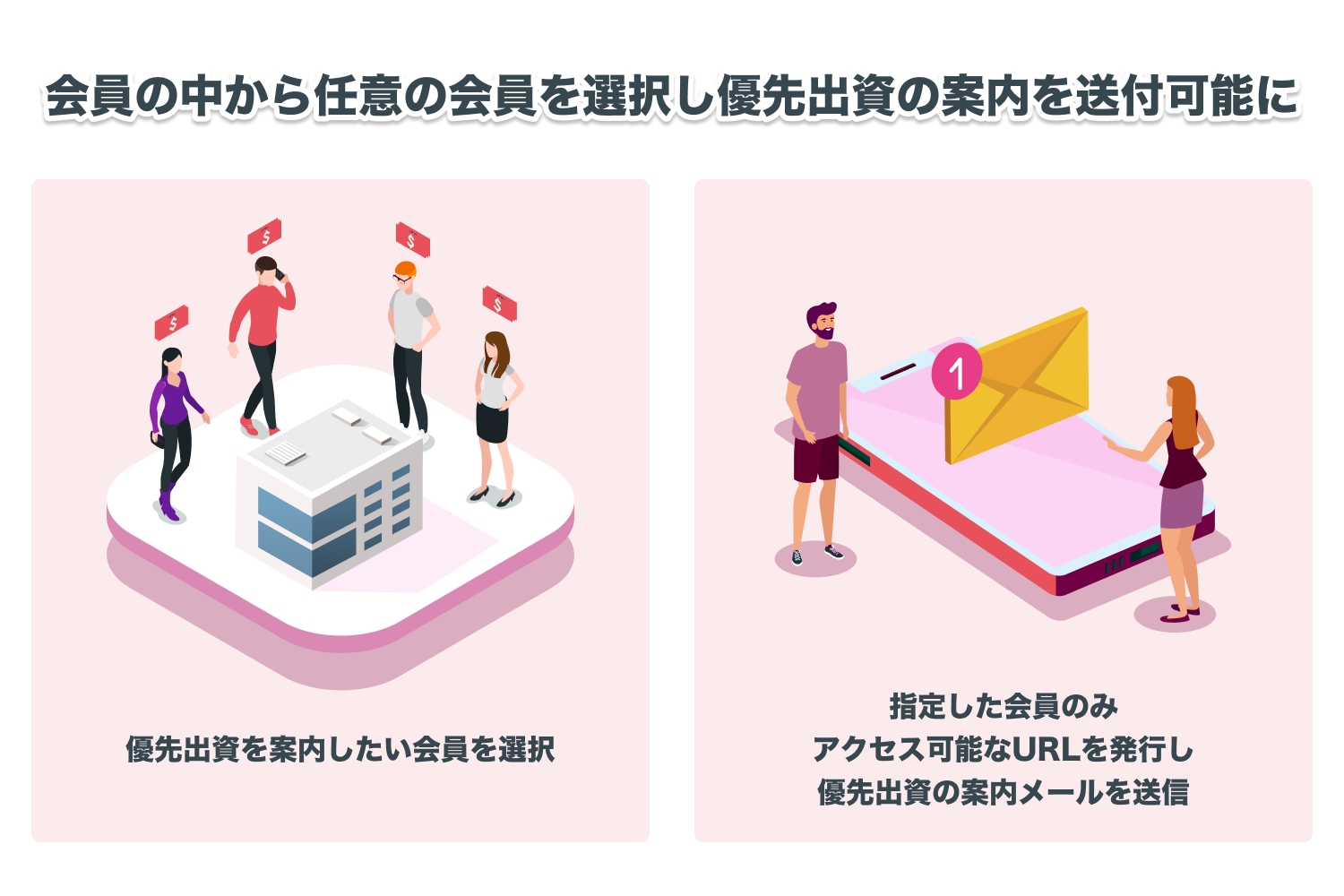 本システムにおける優先出資機能は、優先出資専用URLを発行するだけでなく、投資家を選択してより限定的に優先出資の案内をすることができる機能です。
