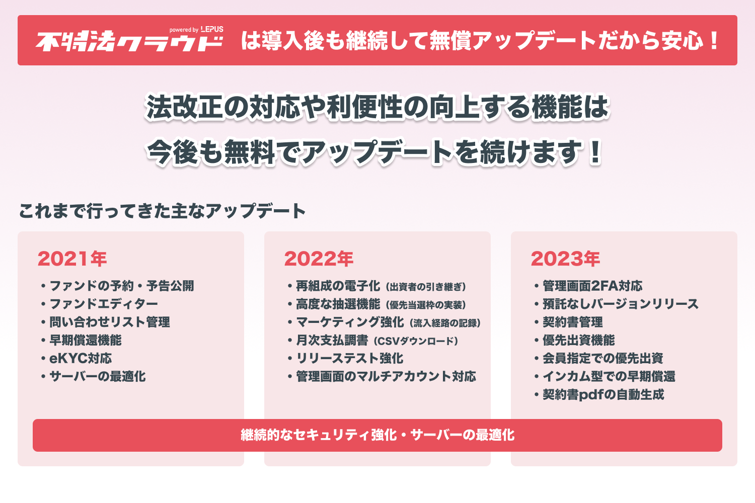 「不特法クラウドプロ(預託機能あり)」には昨年9月に実装し、好評を得てきた優先出資機能を、「不特法クラウド(預託なし)」にも実装しました。