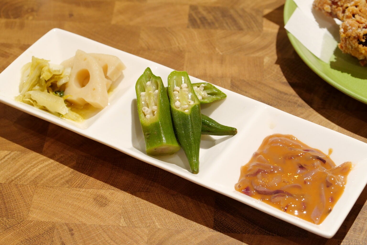 箸休めにもお酒のアテにもなるおつまみを3種盛りにしてご提供します。季節のマリネや塩辛、オクラのおひたしなど、その日のおすすめおつまみをお楽しみいただけます。