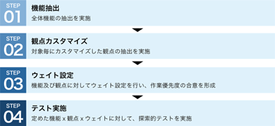 AGESTが提供する「AGEST式探索的テスト」は、テスト工程を短縮したいお客様に最適なソフトウェアテストサービスで、属人的になりがちな傾向をカバーする“AGEST汎用的テストチャータ”を用いることで、安定した品質でサービスを提供いたします。