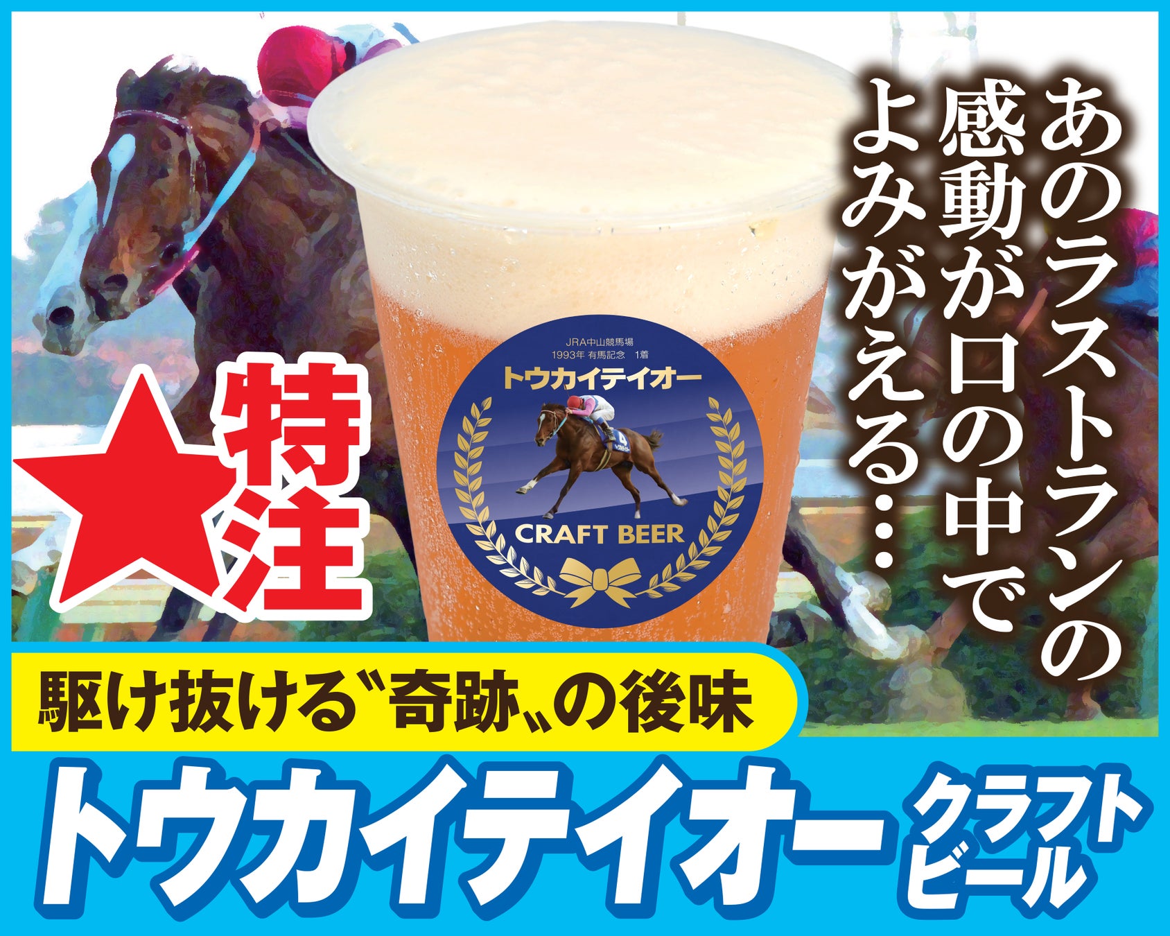 そして、生ビールも当社プロデュース。その名も「トウカイテイオー クラフトビール」。名馬トウカイテイオーが〝奇跡〟を起こした有馬記念、その舞台でもある中山競馬場にふさわしいビールです。