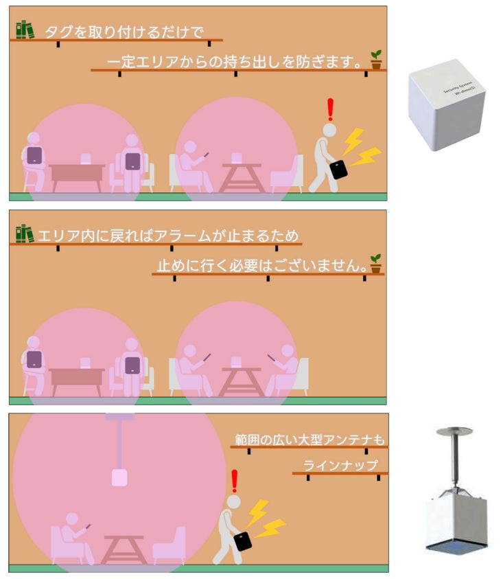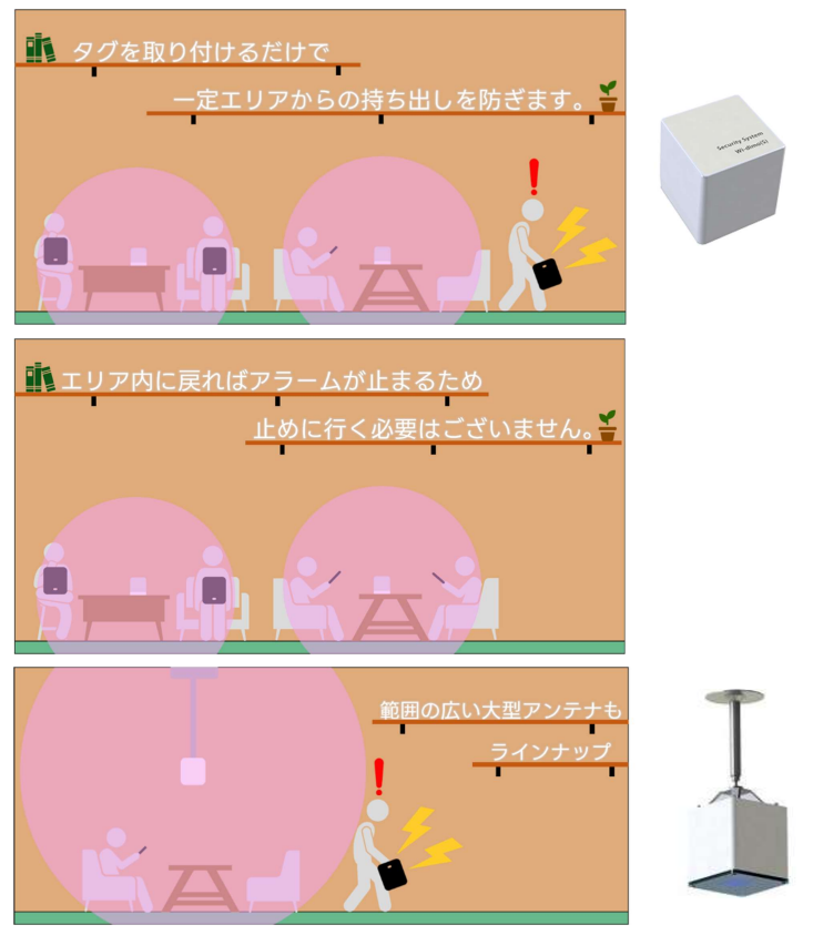 万引き防止ゲートなどの設置工事が不要で、電源と専用自鳴タグさえあれば、すぐに備品や商品などの