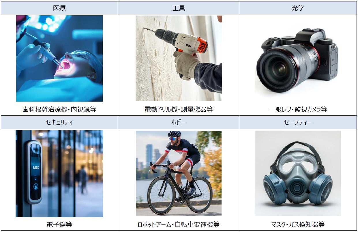 タキロンシーアイが扱うマイクロモータは、電子錠や自転車変速機、防塵マスク等の様々な用途での使用実績があり、さらに優れた制御性や省エネルギーの特性を持つことから、高度な制御が求められる医療・ロボット分野での活用が期待されます。