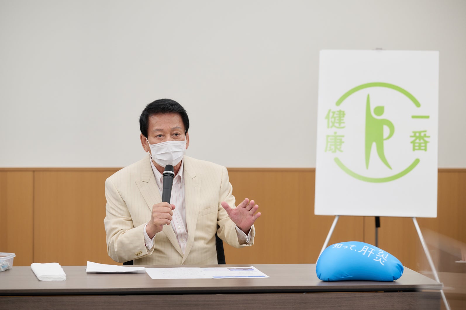 2019年に「知って、肝炎プロジェクト」の集中広報県に指定されていた青森県。当時の肝炎対策を振り返り、杉氏は「2019年に青森県庁を訪れ、肝炎をどうしたら撲滅できるのかなど、知事や専門医と肝炎対策を行いました。現在では、C型肝炎は、飲み薬でほとんど完治できる薬があります。肝臓は”沈黙の臓器”と言われ、自覚症状がほとんどありません。症状が出ていないから検査に行く必要がないと思ってしまう。それが肝炎の大きな落とし穴です。(感染していることに気がつかず)放置していると肝硬変や肝がんに進行してしまう、恐ろしい病気です。だからこそ、先ずは検査を受けてほしい。」と肝炎ウイルス検査の受検の大切さを訴えました。