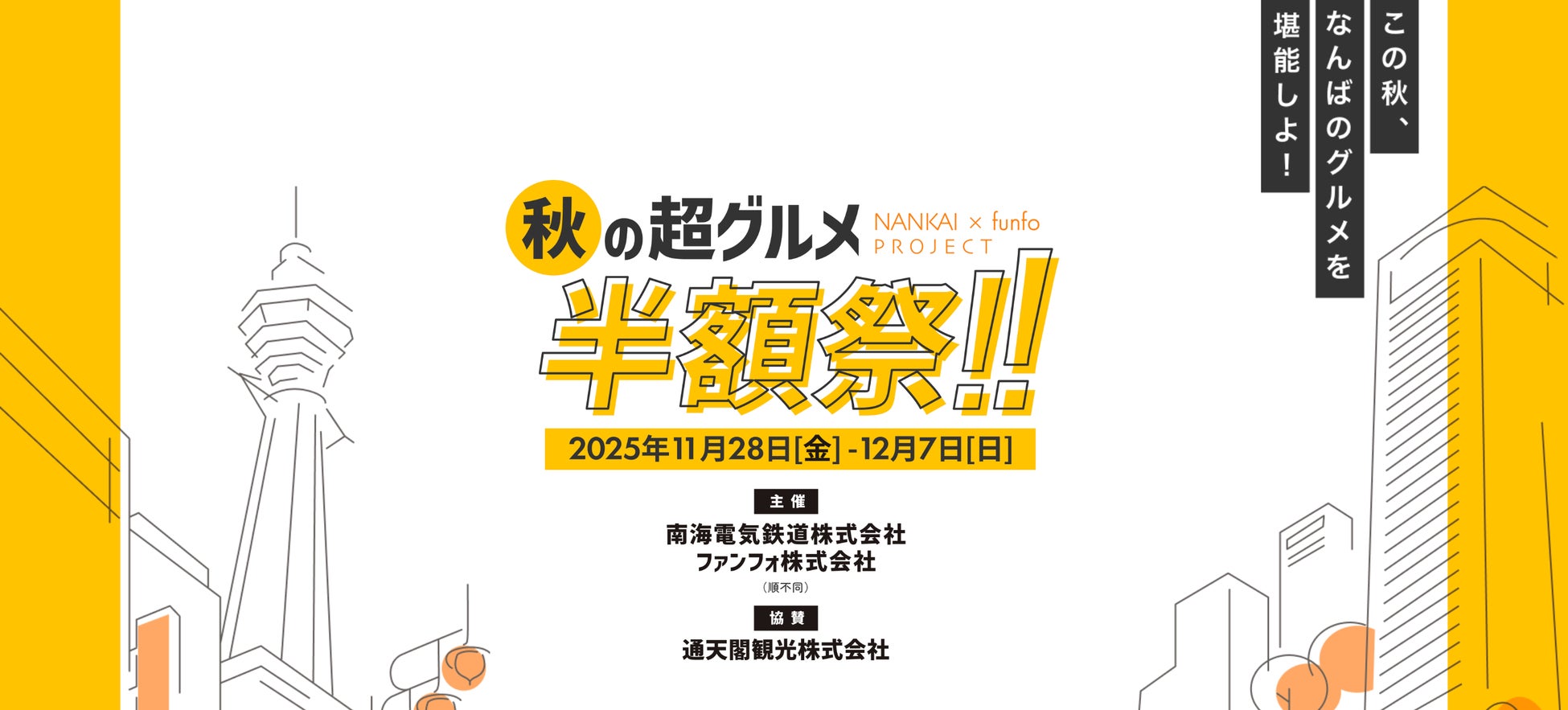 ファンフォ株式会社(本社:京都府京都市下京区、代表取締役:喬 恒越、以下「ファンフォ」)は、南海電気鉄道株式会社(本社:大阪府大阪市浪速区、代表取締役社長:岡嶋 信行、以下「南海」)と共同で、「秋の超グルメ半額祭」をなんばCITY・なんばパークスを中心に実施いたします。