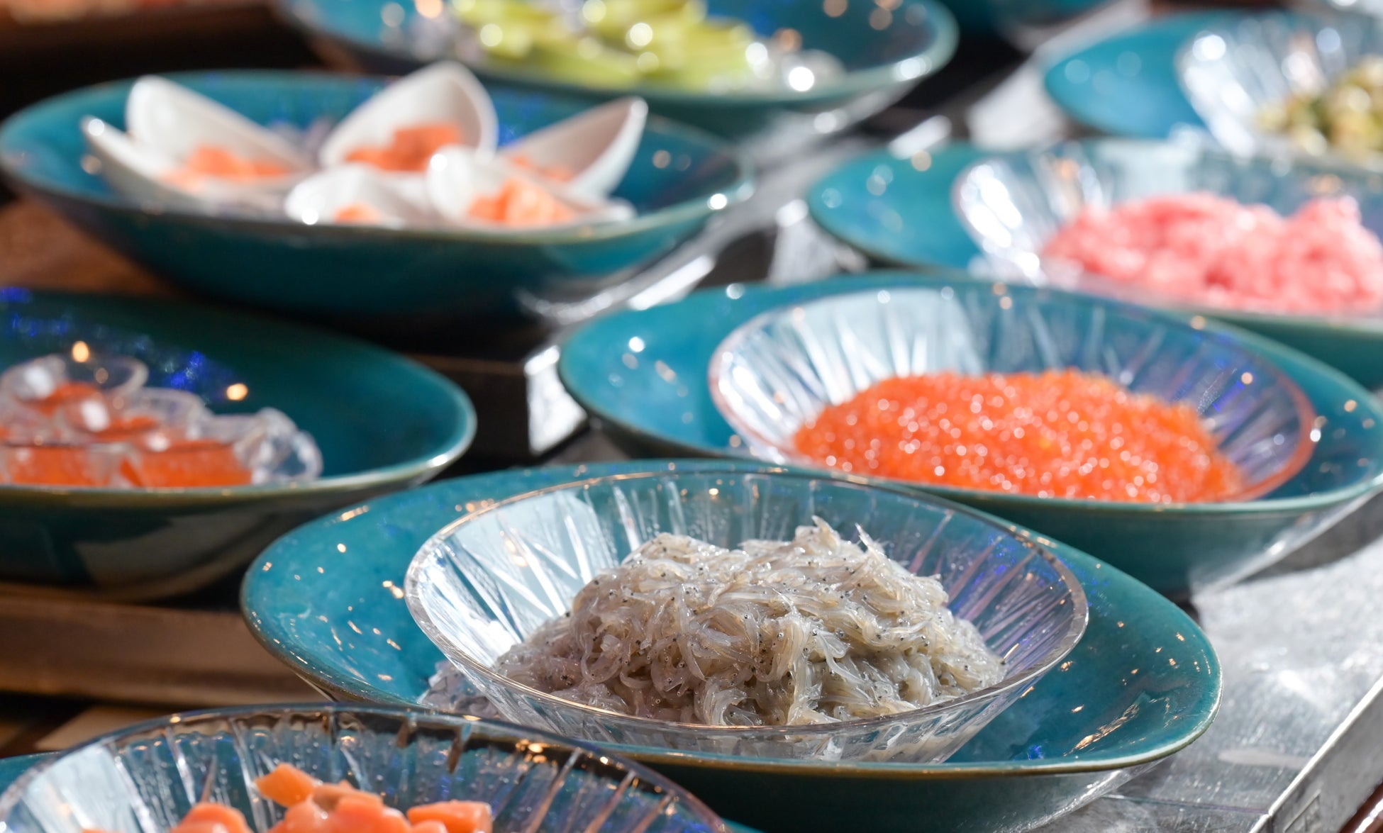 お客様の自由なスタイルで召し上がりいただくバイキングコーナーには、和洋にこだわらず、旬の山海バイキング料理や地産素材を中心としたいばらきの味を再現、地域に根付いた地場料理など海の幸や山の幸の競演です。また、フリードリンクコーナーでは、ソフトドリンクの他、ご夕食時には、各種アルコール飲料もご用意しています。
