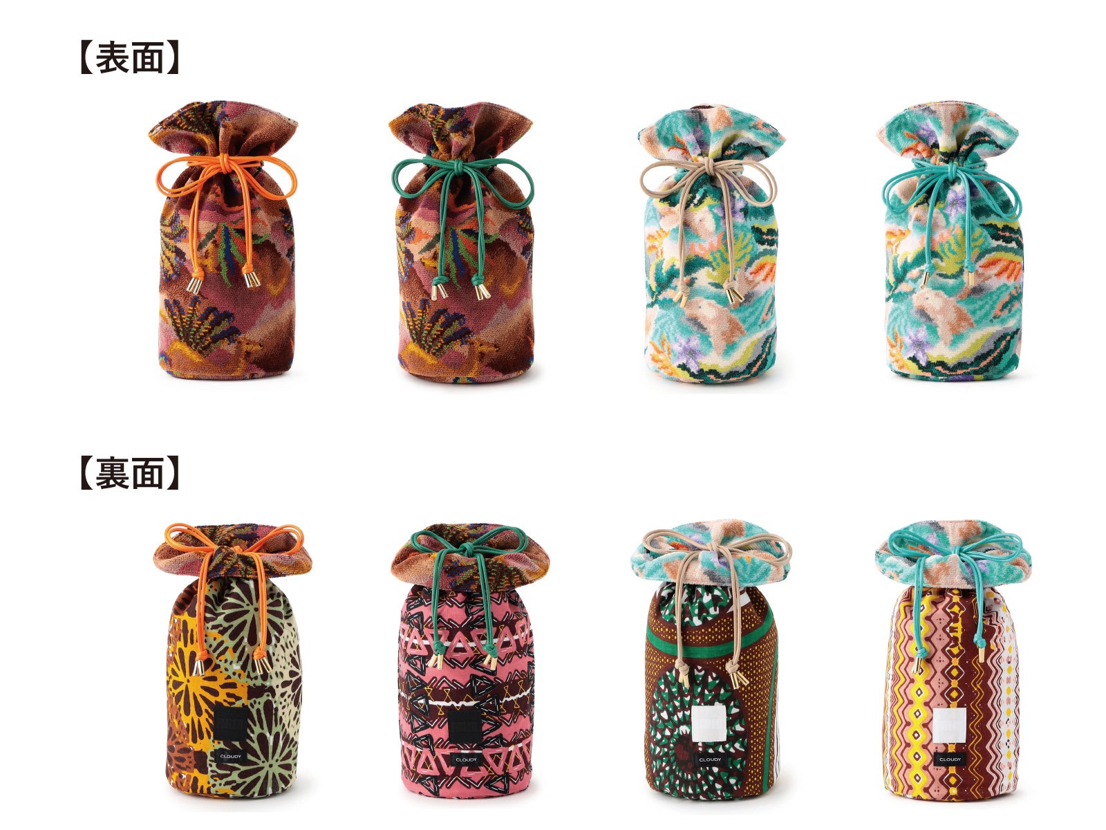 CLOUDYコラボ巾着 4種 各税込13,200円 約縦31×横14×マチ14cm 綿