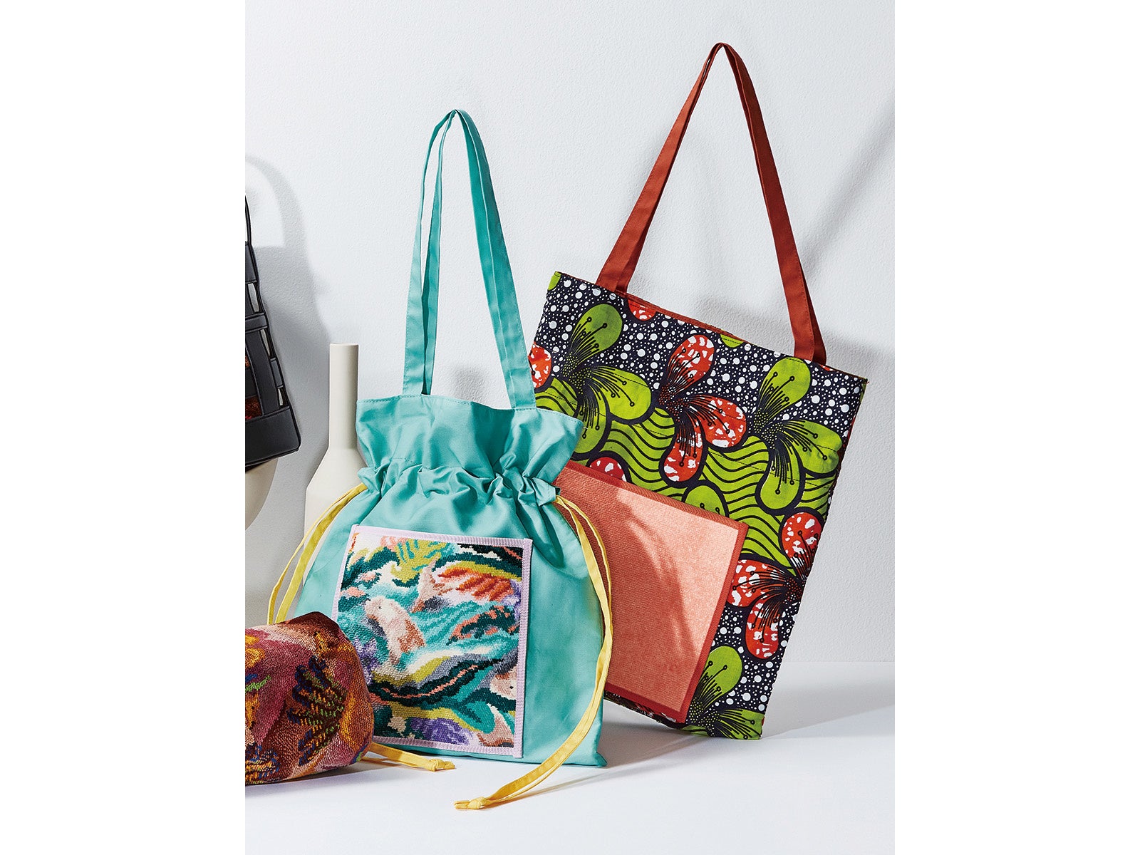 今回フェイラー クリアレーベルから発売されるのは、人気のクラウディオリジナルのバッグ4色。コラボレーションアイテムは、アフリカンファブリックとフェイラーのシュニール織のリゾートムード漂う新作デザイン『シャモ―トロピック(モチーフ:熱帯のキャメル)』『デュゴントロピック(モチーフ:熱帯のジュゴン)』をリバーシブルに仕立てた巾着4種と巾着バッグ2種の合計10種類です。巾着は、バッグとの組み合わせを楽しめるインナーポーチとしてもご提案いたします。